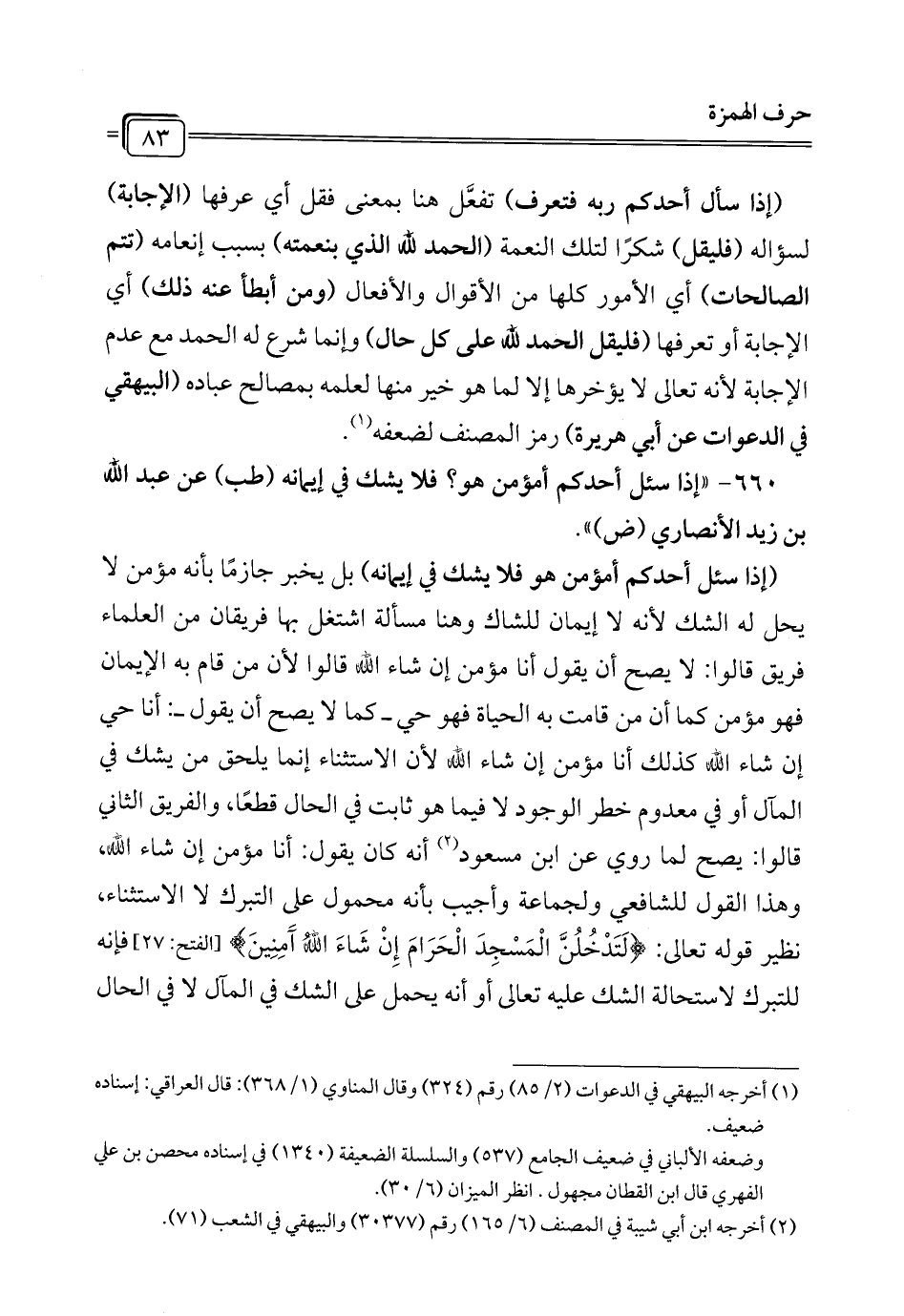 660 - " إذا سئل أحدكم أمؤمن هو؟ فلا يشك في إيمانه (طب) عن عبد الله بن زيد الأنصاري (ض) ".