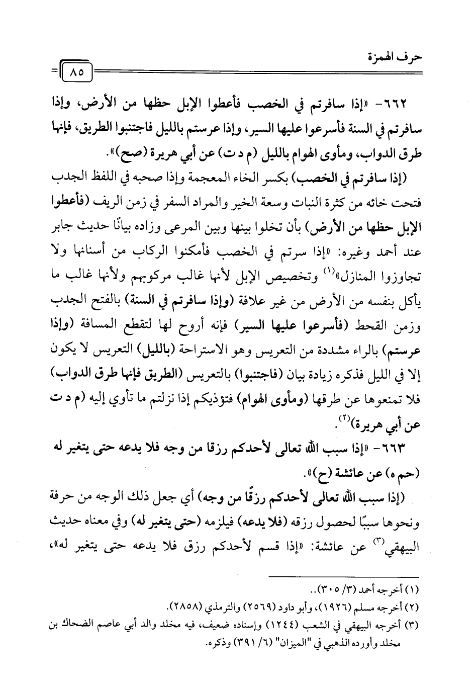 662 - " إذا سافرتم في الخصب فأعطوا الإبل حظها من الأرض، وإذا سافرتم في السنة فأسرعوا عليه السير، وإذا عرستم بالليل فاجتنبوا الطريق، فإنها طرق الدواب، ومأوى الهوام بالليل (م د ت) عن أبي هريرة (صح) ".