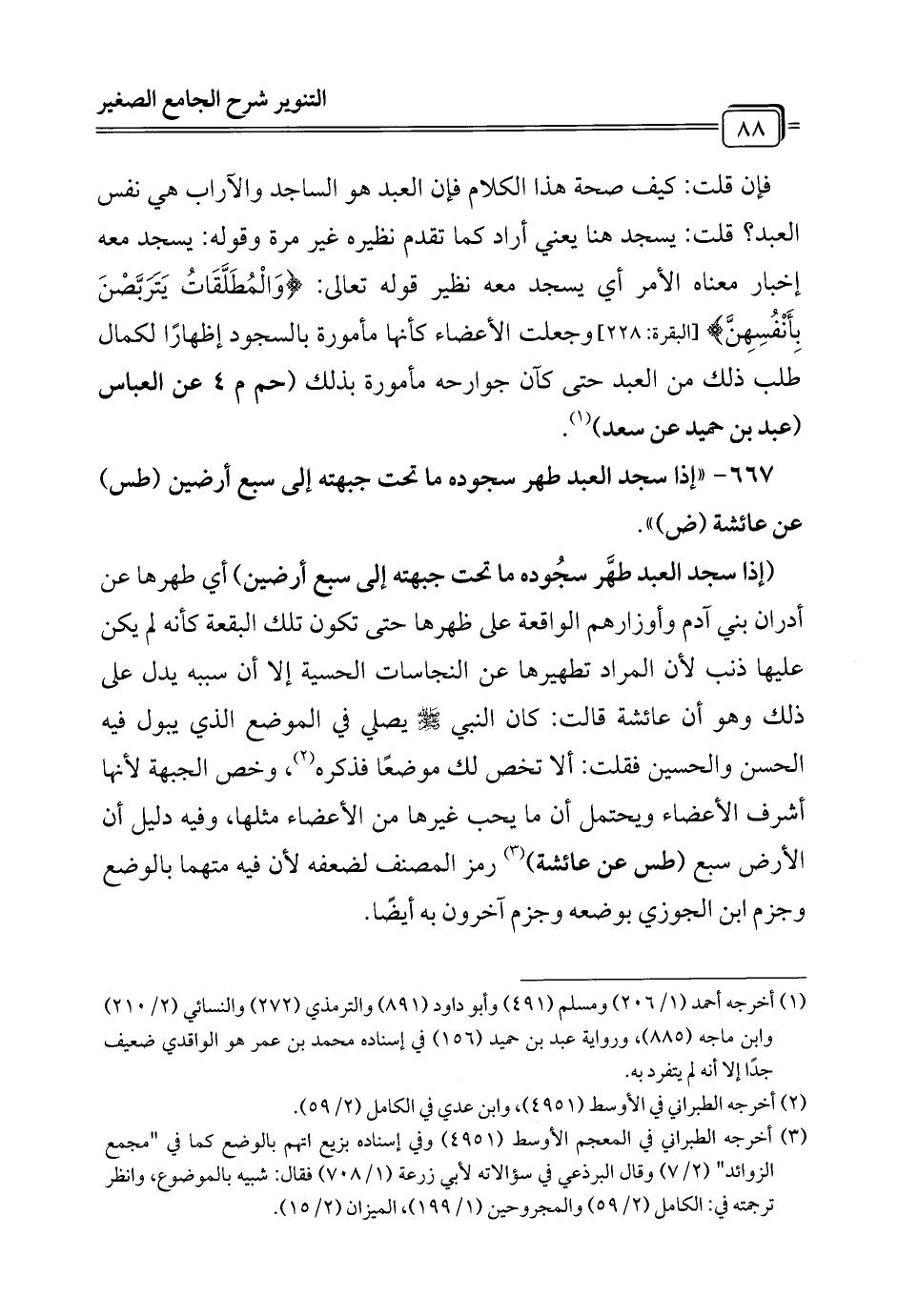 667 - " إذا سجد العبد طهر سجوده ما تحت جبهته إلى سبع أرضين (طس) عن عائشة (ض) ".