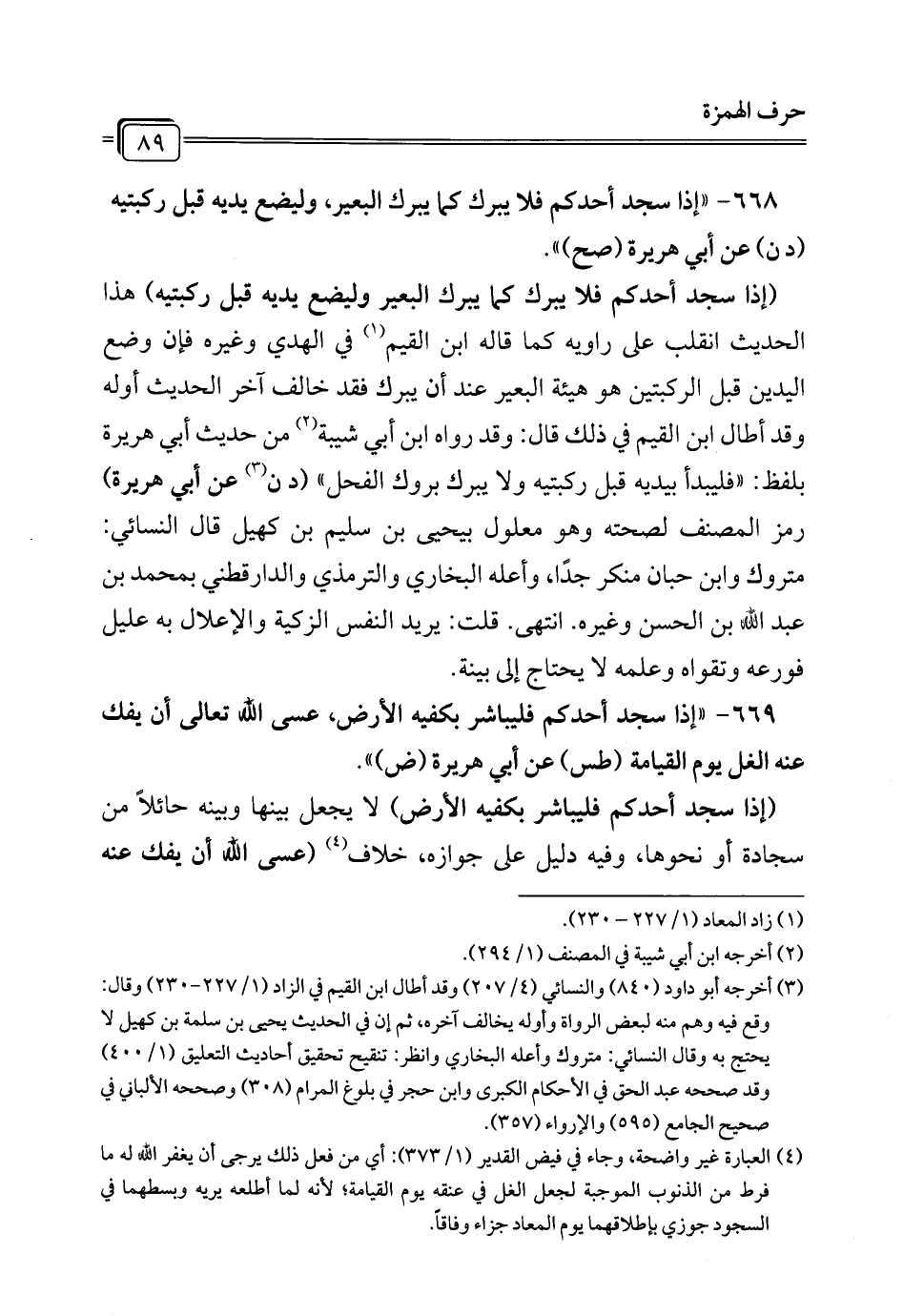 668 - " إذا سجد أحدكم فلا يبرك كما يبرك البعير، وليضع يديه قبل ركبتيه (د ن) عن أبي هريرة (صح) ".