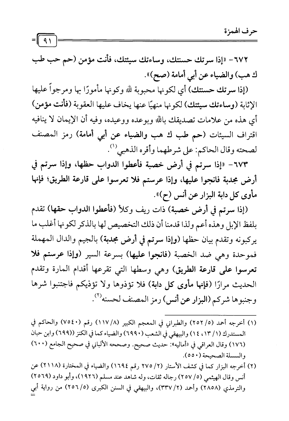 672 - " إذا سرتك حسنتك، وساءتك سيئتك، فأنت مؤمن (حم حب طب ك هب) والضياء عن أبي أمامة (صح) ".