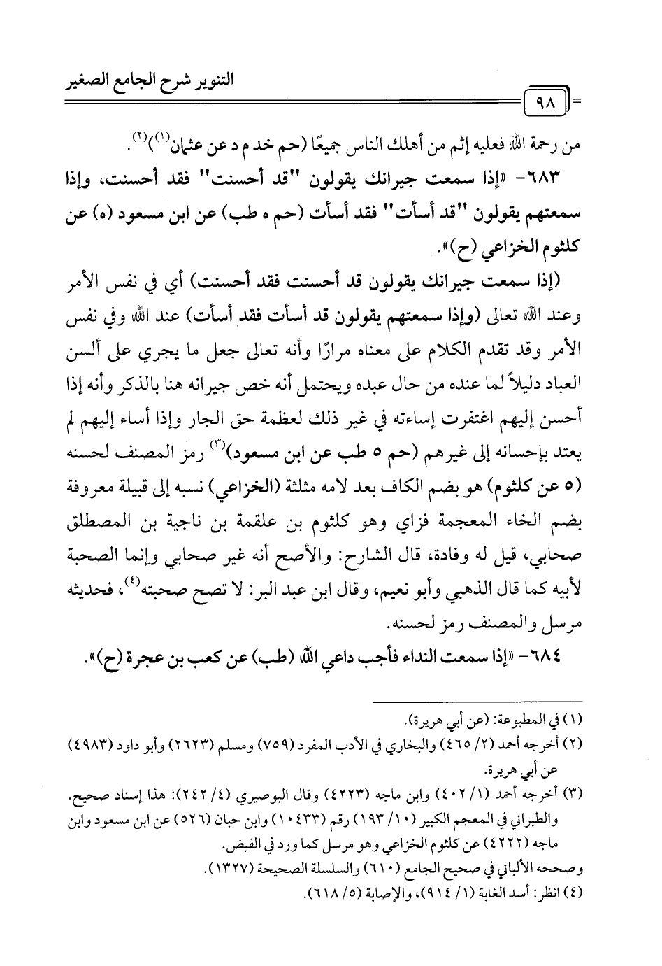683 - " إذا سمعت جيرانك يقولون "قد أحسنت" فقد أحسنت، وإذا سمعتهم يقولون "قد أسأت" فقد أسأت (حم هـ طب) عن ابن مسعود (هـ) عن كلثوم الخزاعي (ح) ".