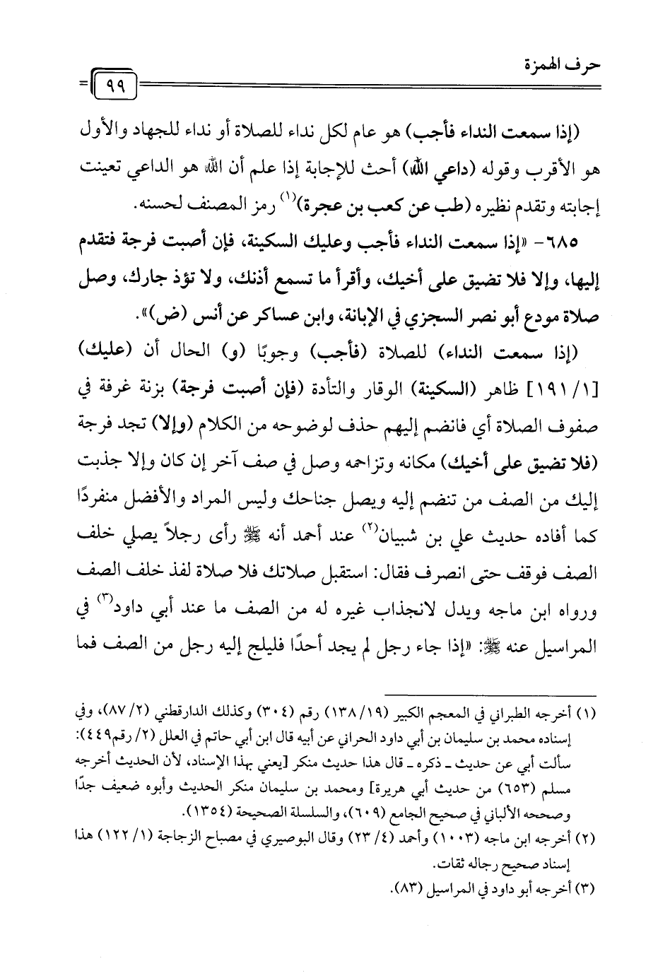 685 - " إذا سمعت النداء فأجب وعليك السكينة، فإن أصبت فرجة فتقدم إليها، وإلا فلا تضيق على أخيك، وأقرأ ما تسمع أذنك، ولا تؤد جارك، وصل صلاة مودع أبو نصر السجزي في الإبانة، وابن عساكر عن أنس (ض) ".