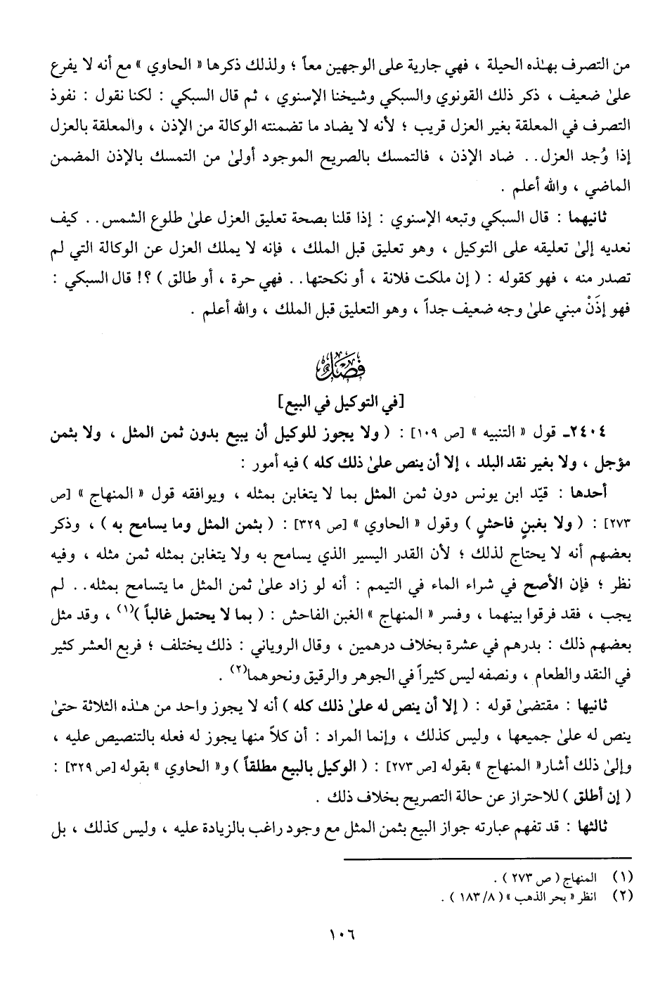 2404 - قول "التنبيه" [ص 109]: (ولا يجوز للوكيل أن يبيع بدون ثمن المثل، ولا بثمن مؤجل، ولا بغير نقد البلد، إلا أن ينص على ذلك كله) فيه أمور: