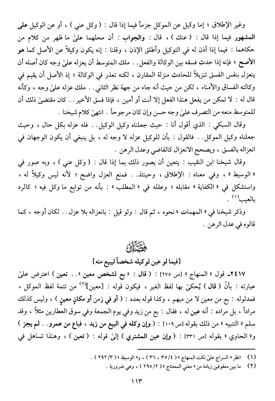 وغير الإطلاق؛ إما وكيل عن الموكل جزماً فيما إذا قال: (وكل عني)، أو عن الوكيل على المشهور فيما إذا قال: (عنك)، قال: والجواب: أن محلهما على ما ظهر من كلام من حكاهما: فيما إذا أذن له في التوكيل وأطلق الإذن، وقلنا: إنه يكون وكيلاً عن الأصل كما هو الأصح؛ فإنه إذا حدث فسقه بين الوكالة والفعل .. ملك المتوسط أن يعزله على وجه كان أصله أن ينعزل بنفس الفسق تنزيلاً للحادث منزلة المقارن، لكنه تعذر في الوكالة؛ إذ الأصل أن يقيم في وكالته الفساق والأمناء، لكن من حيث أنه جاء من جهة نظر الثاني .. ملك عزله على وجه، وكأنه قال له: لا تمكن من يفعل هذا الفعل إلا أنت أو أمين، فإذا فسق الأخير .. كان مقتضى ذلك أن للمتوسط منعه من التصرف على وجه حسن وإن كان مرجوحاً. انتهى كلام شيخنا.