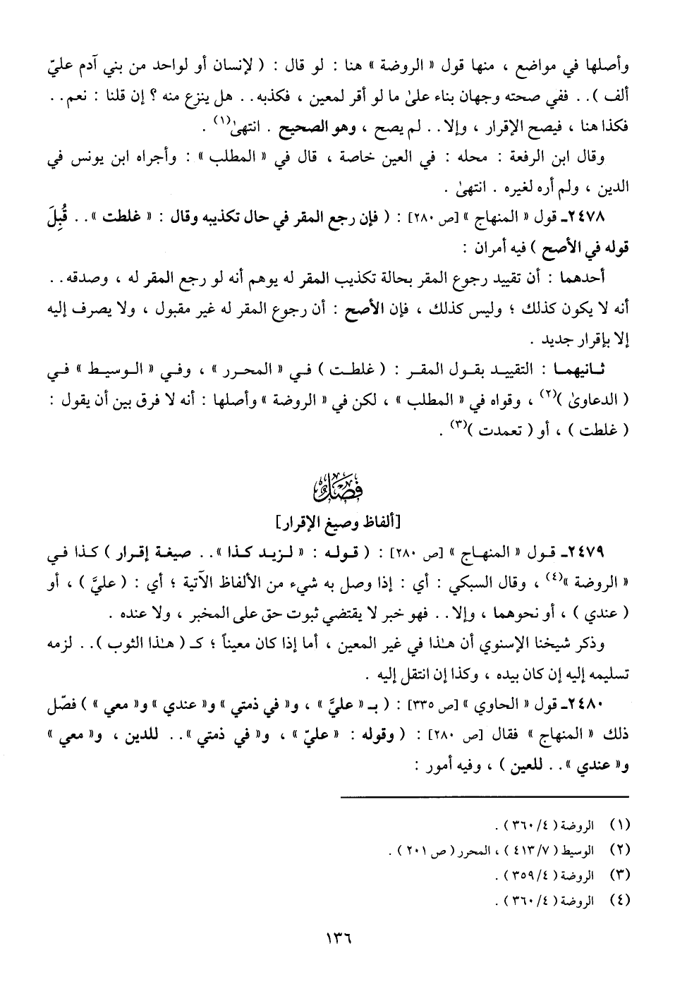 2480 - قول "الحاوي" [ص 335]: (بـ "عليَّ"، و"في ذمتي" و"عندي و"معي") فصّل ذلك "المنهاج" فقال [ص 280]: (وقوله: "عليّ"، و"في ذمتي" .. للدين، و"معي" و"عندي" .. للعين)، وفيه أمور: