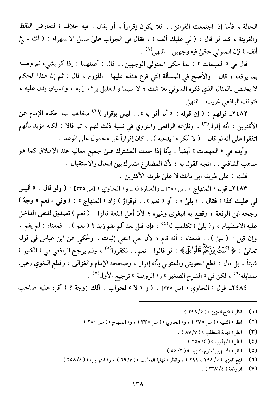 2483 - قول "المنهاج" [ص 280]، - والعبارة له - و"الحاوي" [ص 335]: (ولو قال: "أليس لي عليك كذا" فقال: "بلى"، أو "نعم" .. فإقرارٌ) زاد "المنهاج": (وفي "نعم" وجهٌ) رجحه ابن الرفعة، وقطع به البغوي وغيره؛ لأن أهل اللغة قالوا: (نعم) تصديق للنفي الداخل عليه الاستفهام، و (بلى) تكذيب له (¬4)، فإذا قيل بعد ألم يقم زيد؟ (نعم) .. فمعناه: لم يقم، وإن قيل: (بلى). فمعناه: أنه قام؛ لأن نفي النفي إثبات، وحُكي عن ابن عباس في قوله تعالى: {أَلَسْتُ بِرَبِّكُمْ قَالُوا بَلَى}: لو قالوا: نعم .. لكفروا (¬5)، ولم يرجح الرافعي في "الكبير" شيئاً، بل قال: قطع الجويني والمتولي بأنه إقرار، وصححه الإمام والغزالي، وقطع البغوي وغيره بمقابله (¬6)، لكن في "الشرح الصغير" و"الروضة" ترجيح الأول (¬7).