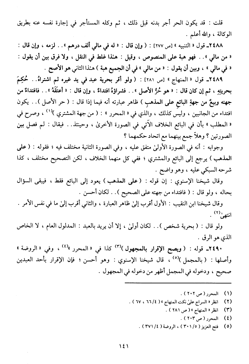 2489 - قول "المنهاج" [ص 281]: (ولو أقر بحرية عبد في يد غيره ثم اشتراهُ .. حُكِمَ بحريتِهِ، ثم إن كان قال: "هو حُرُّ الأصل" .. فشراؤهُ افتداءٌ، وإن قال: "أعتقه" .. فافتداءٌ من جهته وبيعٌ من جهةِ البائعِ على المذهبِ) ظاهر عبارته أنه فيما إذا قال: (حر الأصل) .. يكون افتداء من الجانبين، وليس كذلك، والذي في "المحرر": (من جهة المشتري) (¬1)، وصرح في "المطلب" بأن في البائع الخلاف الآتي في الصورة الأخرى، وحينئذ .. فيقال: لم فصل بين الصورتين؛ وهلاّ جمع بينهما مع اتحاد حكمهما؟