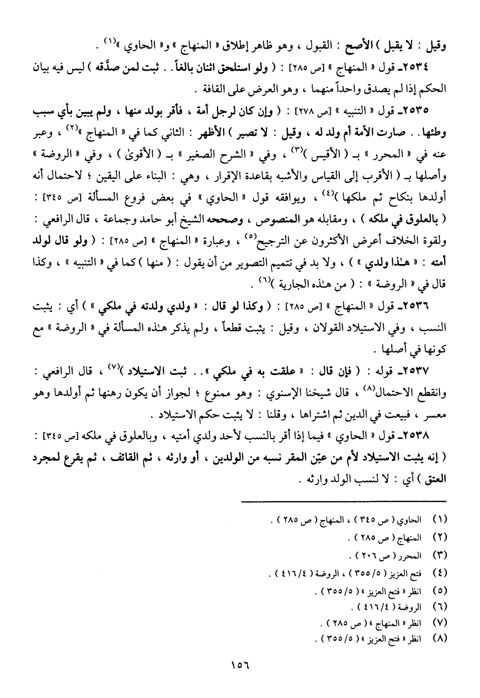 2538 - قول "الحاوي" فيما إذا أقر بالنسب لأحد ولدي أمتيه، وبالعلوق في ملكه [ص 345]: (إنه يثبت الاستيلاد لأم من عيّن المقر نسبه من الولدين، أو وارثه، ثم القائف، ثم يقرع لمجرد العتق) أي: لا لنسب الولد وارثه.