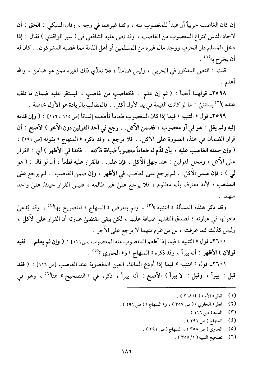 2600 - قول "التنبيه" فيما إذا أطعم المغصوب منه المغصوب [ص 116]: (وإن لم يعلم .. ففيه قولان) الأظهر: أنه يبرأ، وقد ذكره "المنهاج" و"الحاوي" (¬5).