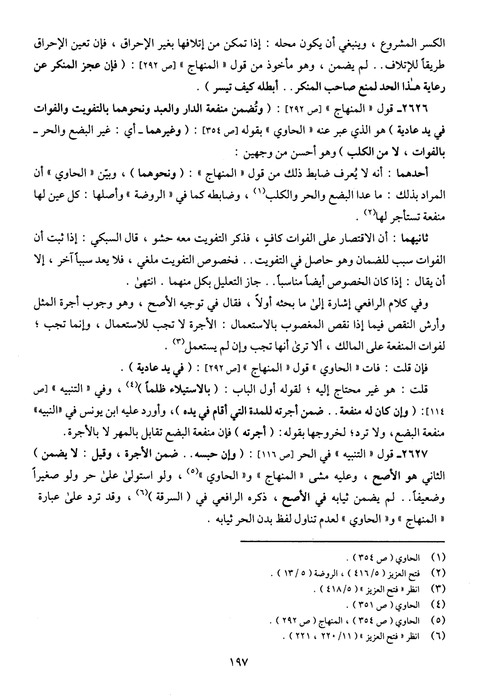 2626 - قول "المنهاج" [ص 292]: (وتُضمن منفعة الدار والعبد ونحوهما بالتفويت والفوات في بد عادية) هو الذي عبر عنه "الحاوي" بقوله [ص 354]: (وغيرهما - أي: غير البضع والحر - بالفوات، لا من الكلب) وهو أحسن من وجهين:
