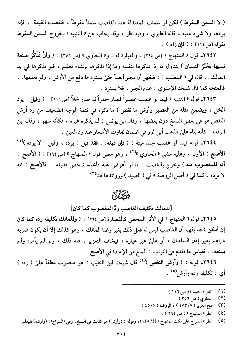 2643 - قول "التنبيه" فيما لو غصب عصيراً فصار خمراً ثم صار خلاً [ص 116]: (وقيل: يرد الخل، ويضمن مثله من العصير وأرش ما نقص) ما ذكره في تتمة الوجه الضعيف من رد أرش النقص هو في بعض النسخ دون بعضها، وقال ابن يونس: لم يذكره غيره، فكأنه سهو، وقال ابن الرفعة: كأنه بناه على مذهب أبي ثور في ضمان تفاوت الأسعار عند رد العين.