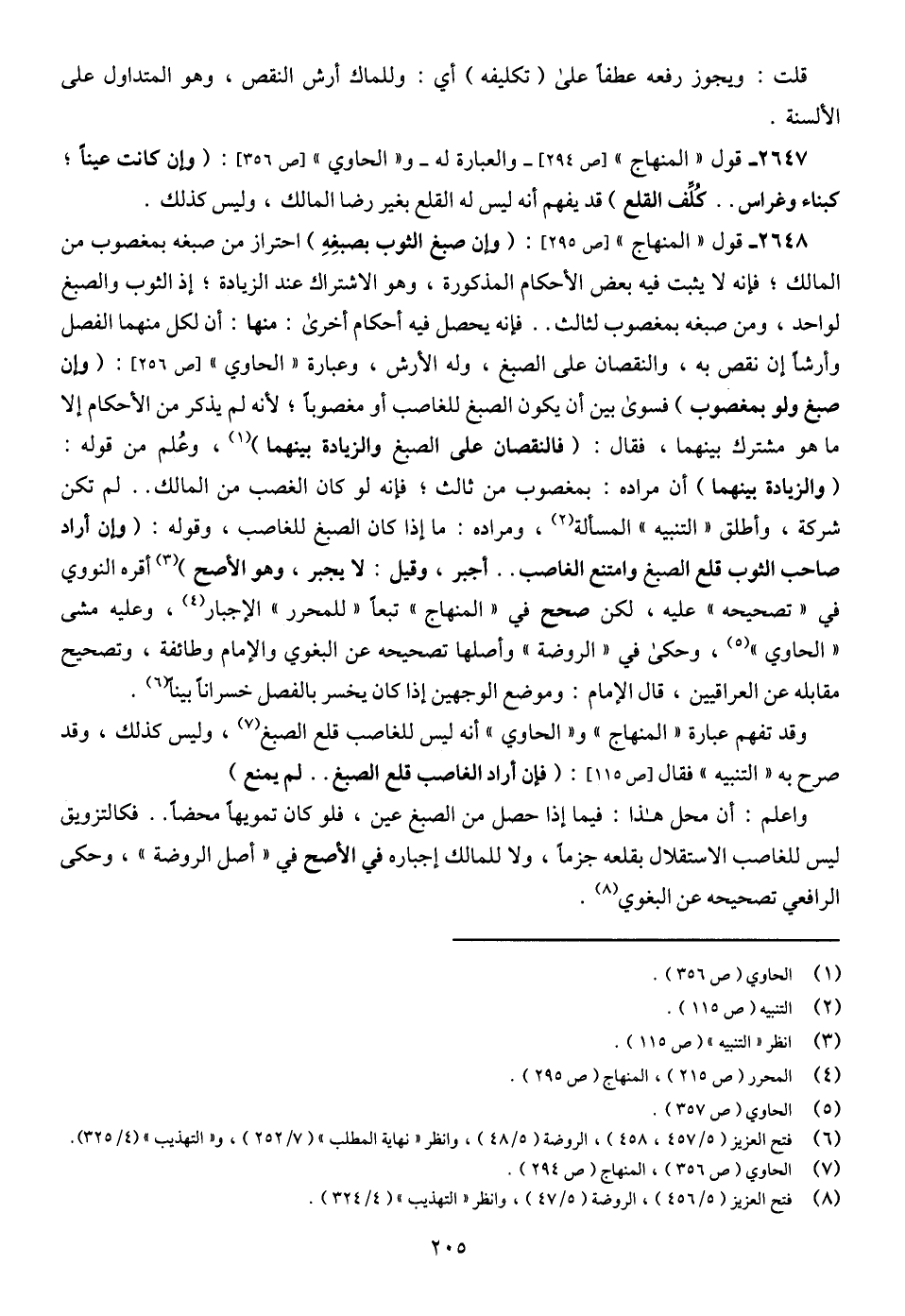 2648 - قول "المنهاج" [ص 295]: (وإن صبغ الثوب بصبغِهِ) احتراز من صبغه بمغصوب من المالك؛ فإنه لا يثبت فيه بعض الأحكام المذكورة، وهو الاشتراك عند الزيادة؛ إذ الثوب والصبغ لواحد، ومن صبغه بمغصوب لثالث .. فإنه يحصل فيه أحكام أخرى: منها: أن لكل منهما الفصل وأرشاً إن نقص به، والنقصان على الصبغ، وله الأرش، وعبارة "الحاوي" [ص 256]: (وإن صبغ ولو بمغصوب) فسوى بين أن يكون الصبغ للغاصب أو مغصوباً؛ لأنه لم يذكر من الأحكام إلا ما هو مشترك بينهما، فقال: (فالنقصان على الصبغ والزيادة بينهما) (¬1)، وعُلم من قوله: (والزيادة بينهما) أن مراده: بمغصوب من ثالث؛ فإنه لو كان الغصب من المالك .. لم تكن شركة، وأطلق "التنبيه" المسألة (¬2)، ومراده: ما إذا كان الصبغ للغاصب، وقوله: (وإن أراد صاحب الثوب قلع الصبغ وامتنع الغاصب .. أجبر، وقيل: لا يجبر، وهو الأصح) (¬3) أقره النووي في "تصحيحه" عليه، لكن صحح في "المنهاج" تبعاً "للمحرر" الإجبار (¬4)، وعليه مشى "الحاوي" (¬5)، وحكى في "الروضة" وأصلها تصحيحه عن البغوي والإمام وطائفة، وتصحيح مقابله عن العراقيين، قال الإمام: وموضع الوجهين إذا كان يخسر بالفصل خسراناً بينا" (¬6).