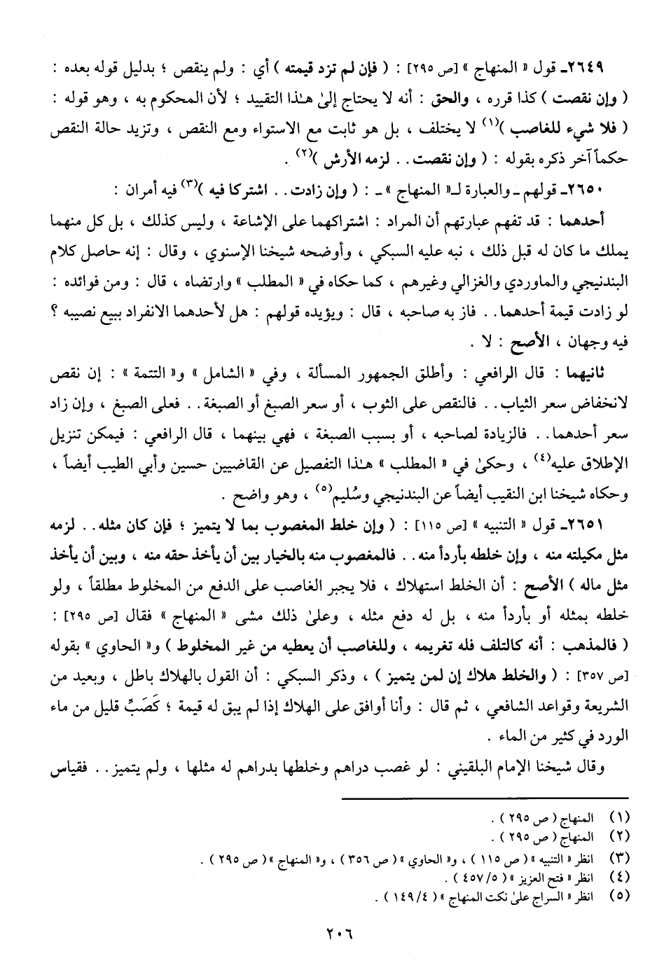 2651 - قول "التنبيه" [ص 115]: (وإن خلط المغصوب بما لا يتميز؛ فإن كان مثله .. لزمه مثل مكيلته منه، وإن خلطه بأردأ منه .. فالمغصوب منه بالخيار بين أن يأخذ حقه منه، وبين أن يأخذ مثل ماله) الأصح: أن الخلط استهلاك، فلا يجبر الغاصب على الدفع من المخلوط مطلقاً، ولو خلطه بمثله أو بأردأ منه، بل له دفع مثله، وعلى ذلك مشى "المنهاج" فقال [ص 295]: (فالمذهب: أنه كالتلف فله تغريمه، وللغاصب أن يعطيه من غير المخلوط) و"الحاوي" بقوله [ص 357]: (والخلط هلاك إن لمن يتميز)، وذكر السبكي: أن القول بالهلاك باطل، وبعيد من الشريعة وقواعد الشافعي، ثم قال: وأنا أوافق على الهلاك إذا لم يبق له قيمة؛ كَصَبّ قليل من ماء الورد في كثير من الماء.