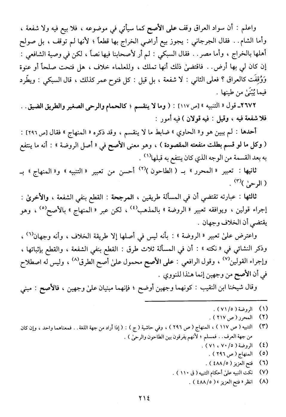 واعلم: أن سواد العراق وقف على الأصح كما سيأتي في موضوعه، فلا بيع فيه ولا شفعة، وأما الشام .. فقال الجرجاني: يجوز بيع أراضي الخراج بها قطعاً؛ لأنها لم توقف، بل صولح أهلها بالخراج، وأما مصر .. فقال السبكي: لم أر لأصحابنا فيها نصاً، لكن في وصية الشافعي: إن كان لي بها أرض .. فاقتضى ذلك أنها تملك، وللعلماء خلاف، هل فتحت صلحاً أو عنوة وَوُقِفَت كالعراق؟ فعلى الثاني: لا شفعة، بل قيل: كل فتوح عمر كذلك، قال السبكي: ويطّرد فيما يُبْنَى من طينها.