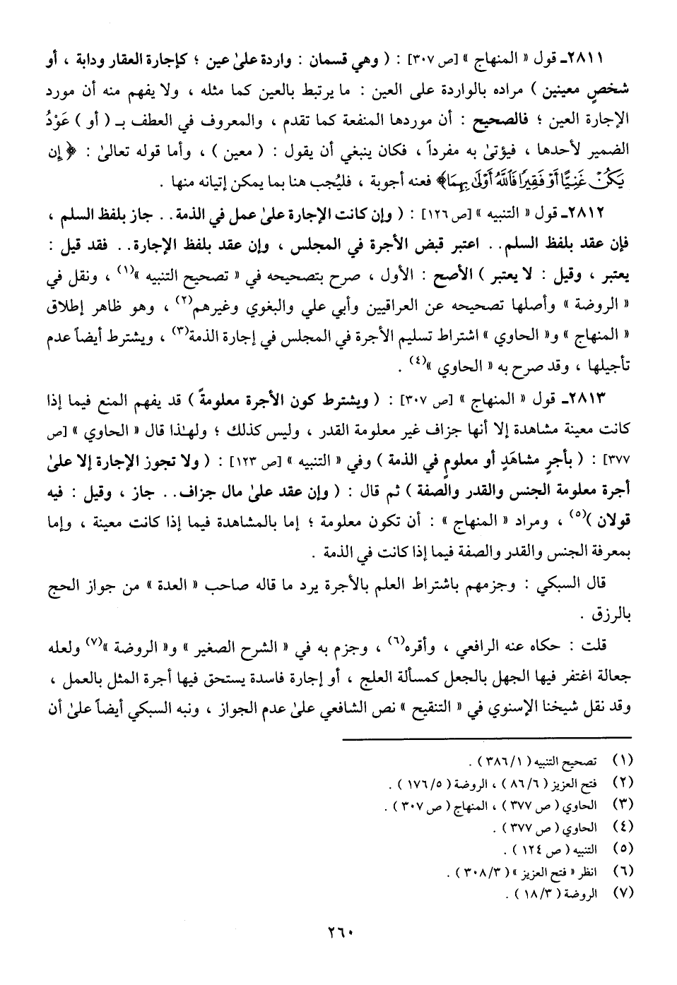 2811 - قول "المنهاج" [ص 307]: (وهي قسمان: واردة على عين؛ كإجارة العقار ودابة، أو شخصٍ معينين) مراده بالواردة على العين: ما يرتبط بالعين كما مثله، ولا يفهم منه أن مورد الإجارة العين؛ فالصحيح: أن موردها المنفعة كما تقدم، والمعروف في العطف بـ (أو) عَوْدُ الضمير لأحدها، فيؤتى به مفردًا، فكان ينبغي أن يقول: (معين)، وأمَّا قوله تعالى: {إِنْ يَكُنْ غَنِيًّا أَوْ فَقِيرًا فَاللَّهُ أَوْلَى بِهِمَا} فعنه أجوبة، فليُجب هنا بما يمكن إتيانه منها.