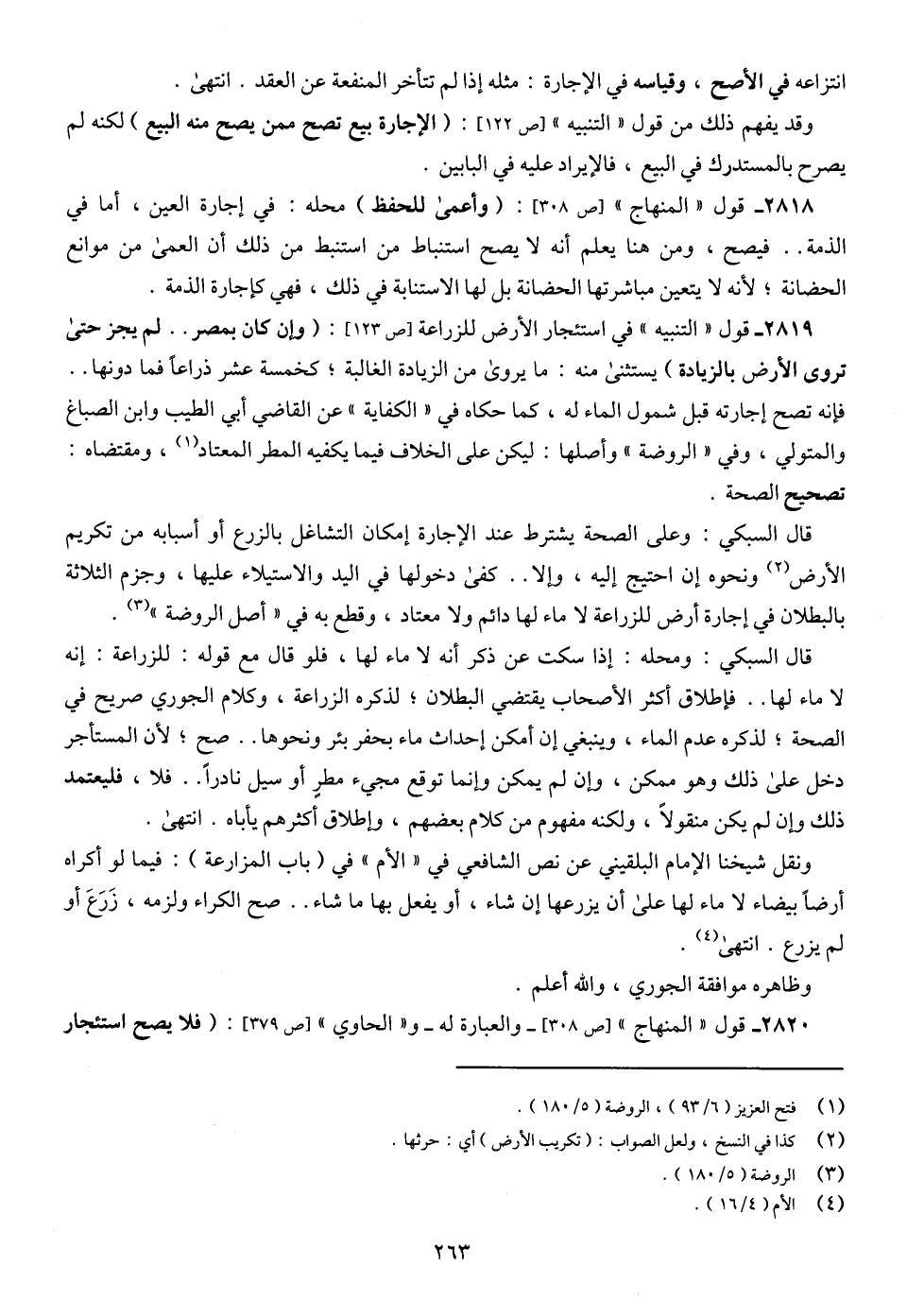 2819 - قول "التَّنبيه" في استئجار الأرض للزراعة [ص 123]: (وإن كان بمصر .. لم يجز حتَّى تروى الأرض بالزيادة) يستثنى منه: ما يروى من الزيادة الغالبة؛ كخمسة عشر ذراعاً فما دونها .. فإنَّه تصح إجارته قبل شمول الماء له، كما حكاه في "الكفاية" عن القاضي أبي الطَّيِّب وابن الصباغ والمتولي، وفي "الروضة" وأصلها: ليكن على الخلاف فيما يكفيه المطر المعتاد (¬1)، ومقتضاه: تصحيح الصحة.