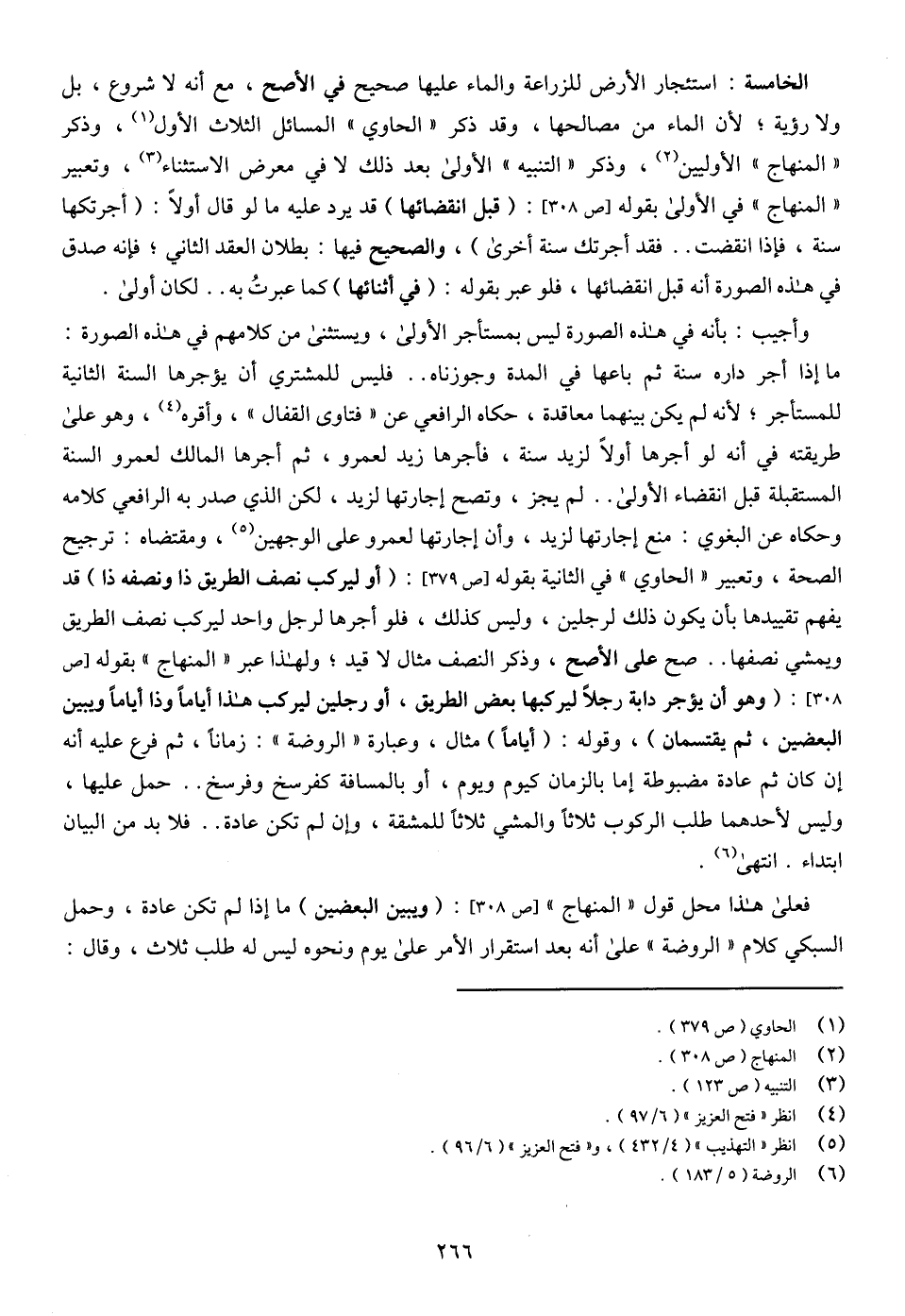 الخامسة: استئجار الأرض للزراعة والماء عليها صحيح في الأصح، مع أنَّه لا شروع، بل ولا رؤية؛ لأنَّ الماء من مصالحها، وقد ذكر "الحاوي" المسائل الثلاث الأوَّل (¬1)، وذكر "المنهاج" الأوليين (¬2)، وذكر "التَّنبيه" الأولى بعد ذلك لا في معرض الاستثناء (¬3)، وتعبير "المنهاج" في الأولى بقوله [ص 308]: (قبل انقضائها) قد يرد عليه ما لو قال أولاً: (أجرتكها سنة، فإذا انقضت .. فقد أجرتك سنة أخرى)، والصحيح فيها: بطلان العقد الثَّاني؛ فإنه صدق في هذه الصورة أنَّه قبل انقضائها، فلو عبر بقوله: (في أثنائها) كما عبرتُ به .. لكان أولى.