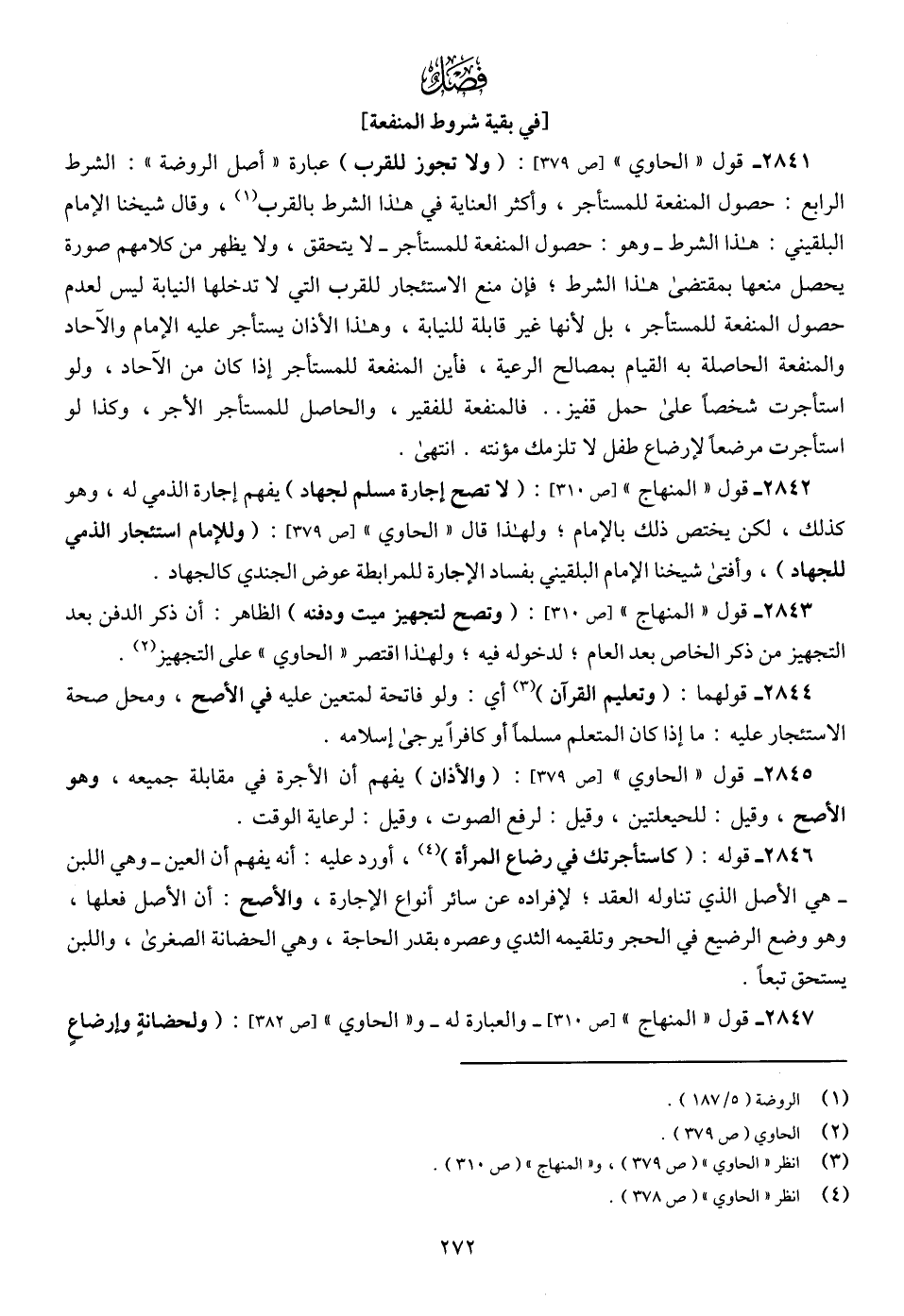 2841 - قول "الحاوي" [ص 379]: (ولا تجوز للقرب) عبارة "أصل الروضة": الشرط الرابع: حصول المنفعة للمستأجر، وأكثر العناية في هذا الشرط بالقرب (¬1)، وقال شيخنا الإمام البلقيني: هذا الشرط - وهو: حصول المنفعة للمستأجر - لا يتحقق، ولا يظهر من كلامهم صورة يحصل منعها بمقتضى هذا الشرط؛ فإن منع الاستئجار للقرب التي لا تدخلها النيابة ليس لعدم حصول المنفعة للمستأجر، بل لأنَّها غير قابلة للنيابة، وهذا الأذان يستأجر عليه الإمام والآحاد والمنفعة الحاصلة به القيام بمصالح الرعية، فأين المنفعة للمستأجر إذا كان من الآحاد، ولو استأجرت شخصاً على حمل قفيز .. فالمنفعة للفقير، والحاصل للمستأجر الأجر، وكذا لو استأجرت مرضعاً لإرضاع طفل لا تلزمك مؤنته. انتهى.