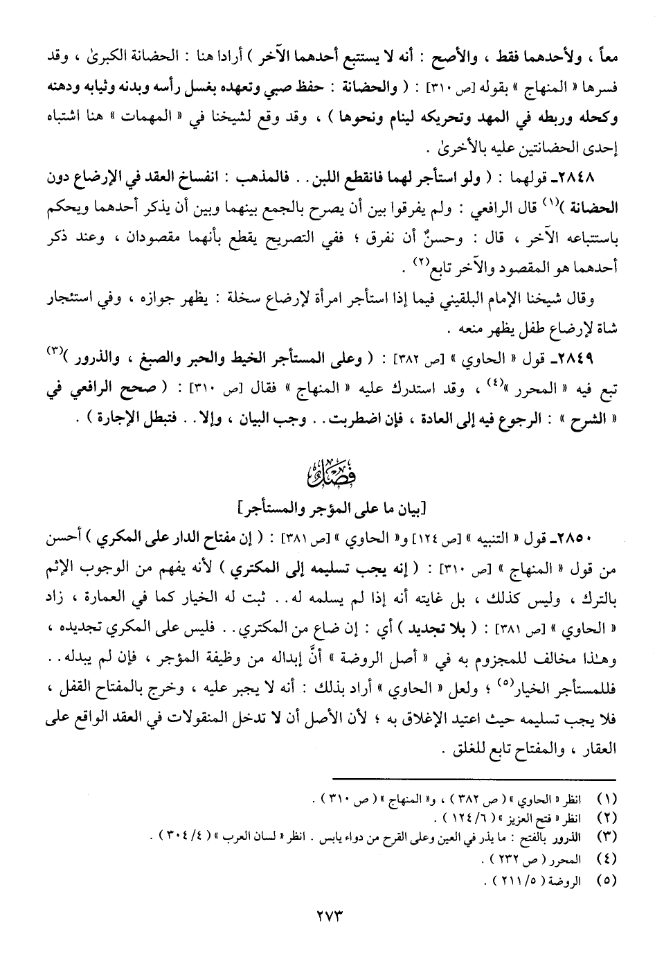 2848 - قولهما: (ولو استأجر لهما فانقطع اللبن .. فالمذهب: انفساخ العقد في الإرضاع دون الحضانة) (¬1) قال الرافعي: ولم يفرقوا بين أن يصرح بالجمع بينهما وبين أن يذكر أحدهما ويحكم باستتباعه الآخر، قال: وحسن أن نفرق؛ ففي التصريح يقطع بأنهما مقصودان، وعند ذكر أحدهما هو المقصود والآخر تابع (¬2).