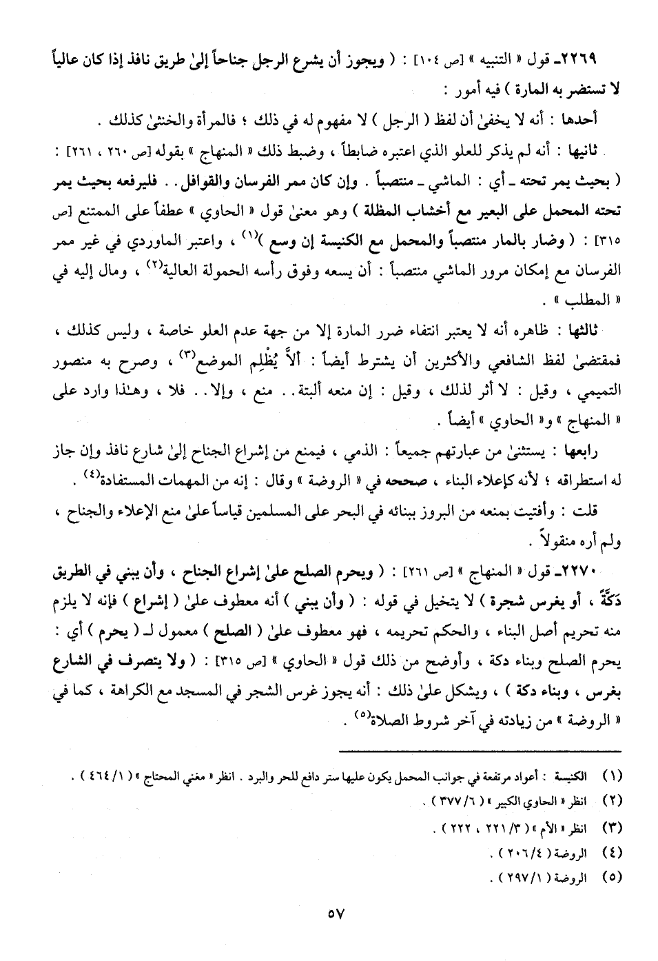 2269 - قول " التنبيه " [ص 104]: (ويجوز أن يشرع الرجل جناحًا إلى طريق نافذ إذا كان عاليًا لا تستضر به المارة) فيه أمور: