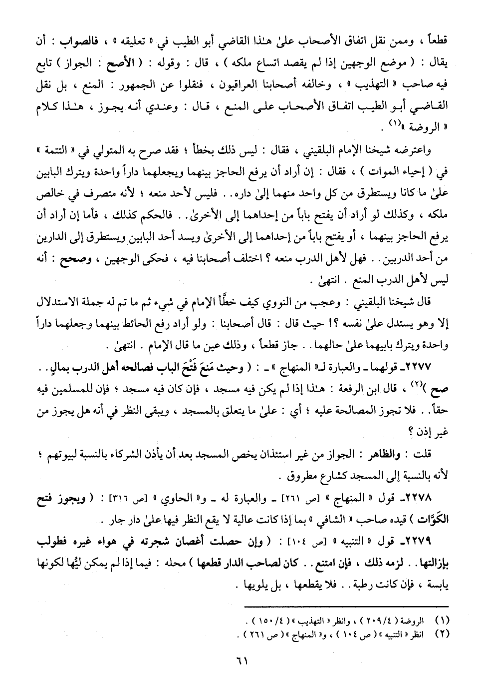 قال شيخنا البلقيني: وعجب من النووي كيف خطَّأ الإمام في شيء ثم ما تم له جملة الاستدلال إلا وهو يستدل على نفسه؟ ! حيث قال: قال أصحابنا: ولو أراد رفع الحائط بينهما وجعلهما دارًا واحدة ويترك بابيهما على حالهما. . جاز قطعًا، وذلك عين ما قال الإمام. انتهى.