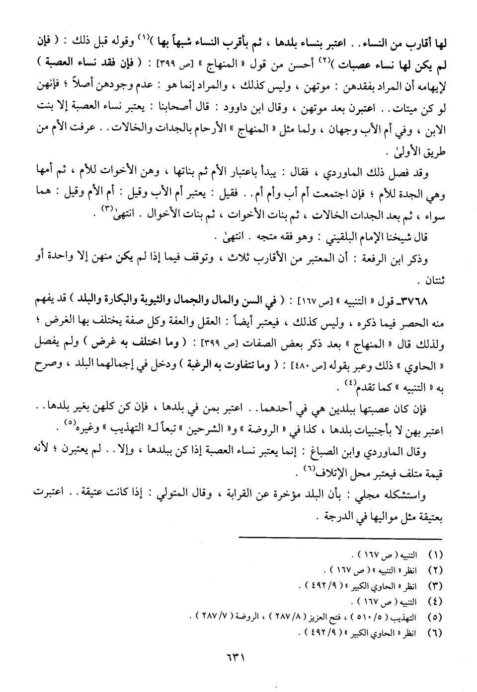 3768 - قول "التنبيه" [ص 167]: (في السن والمال والجمال والثيوبة والبكارة والبلد) قد يفهم منه الحصر فيما ذكره، وليس كذلك، فيعتبر أيضاً: العقل والعفة وكل صفة يختلف بها الغرض؛ ولذلك قال "المنهاج" بعد ذكر بعض الصفات [ص 399]: (وما اختلف به غرض) ولم يفصل "الحاوي" ذلك وعبر بقوله [ص 480]: (وما تتفاوت به الرغبة) ودخل في إجمالهما البلد، وصرح به "التنبيه" كما تقدم (¬4).