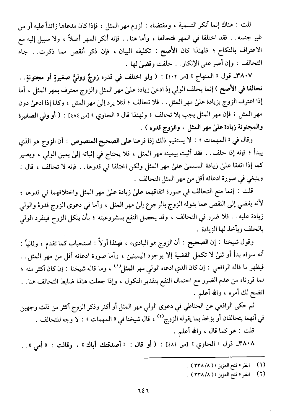 3807 - قول " المنهاج " [ص 402]: (ولو اختلف في قدره زوجٌ ووليُّ صغيرةٍ أو مجنونةٍ .. تحالفا في الأصح) إنما يحلف الولي إذ ادعى زيادة على مهر المثل والزوج معترف بمهر المثل، أما إذا اعترف الزوج بزيادة على مهر المثل .. فلا تحالف؛ لئلا يرد إلى مهر المثل، وكذا إذا ادعى دون مهر المثل؛ فإن مهر المثل يجب بلا تحالف؛ ولهذا قال " الحاوي" [ص 484]: (أو ولي الصغيرة والمجنونة زيادة على مهر المثل، والزوج قدره).