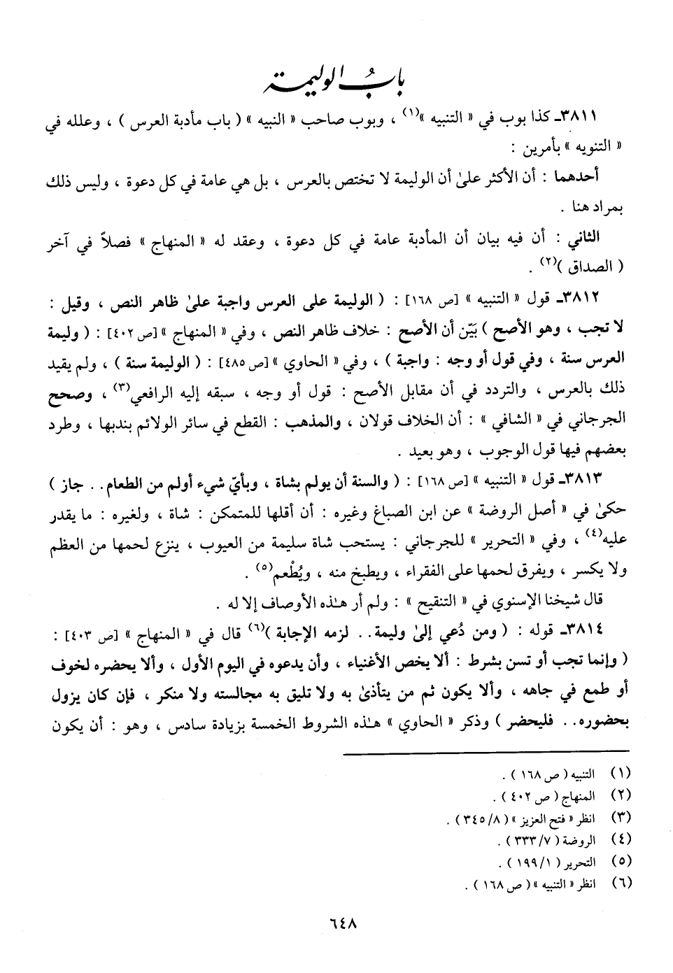 3811 - كذا بوب في " التنبيه " (¬1)، وبوب صاحب " النبيه " (باب مأدبة العرس)، وعلله في " التنويه " بأمرين: