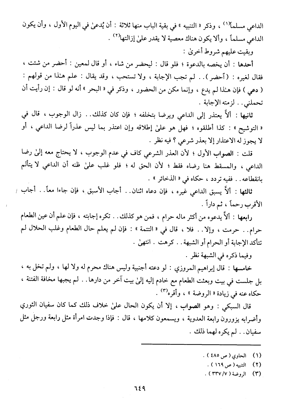 رابعها: ألاَّ يدعوه من أكثر ماله حرام، فمن هو كذلك .. تكره إجابته، فإن علم أن عين الطعام حرام .. حرمت، وإلا .. فلا، قال في " التتمة ": فإن لم يعلم حال الطعام وغلب الحلال لم تتأكد الإجابة أو الحرام أو الشبهة .. كرهت. انتهى.