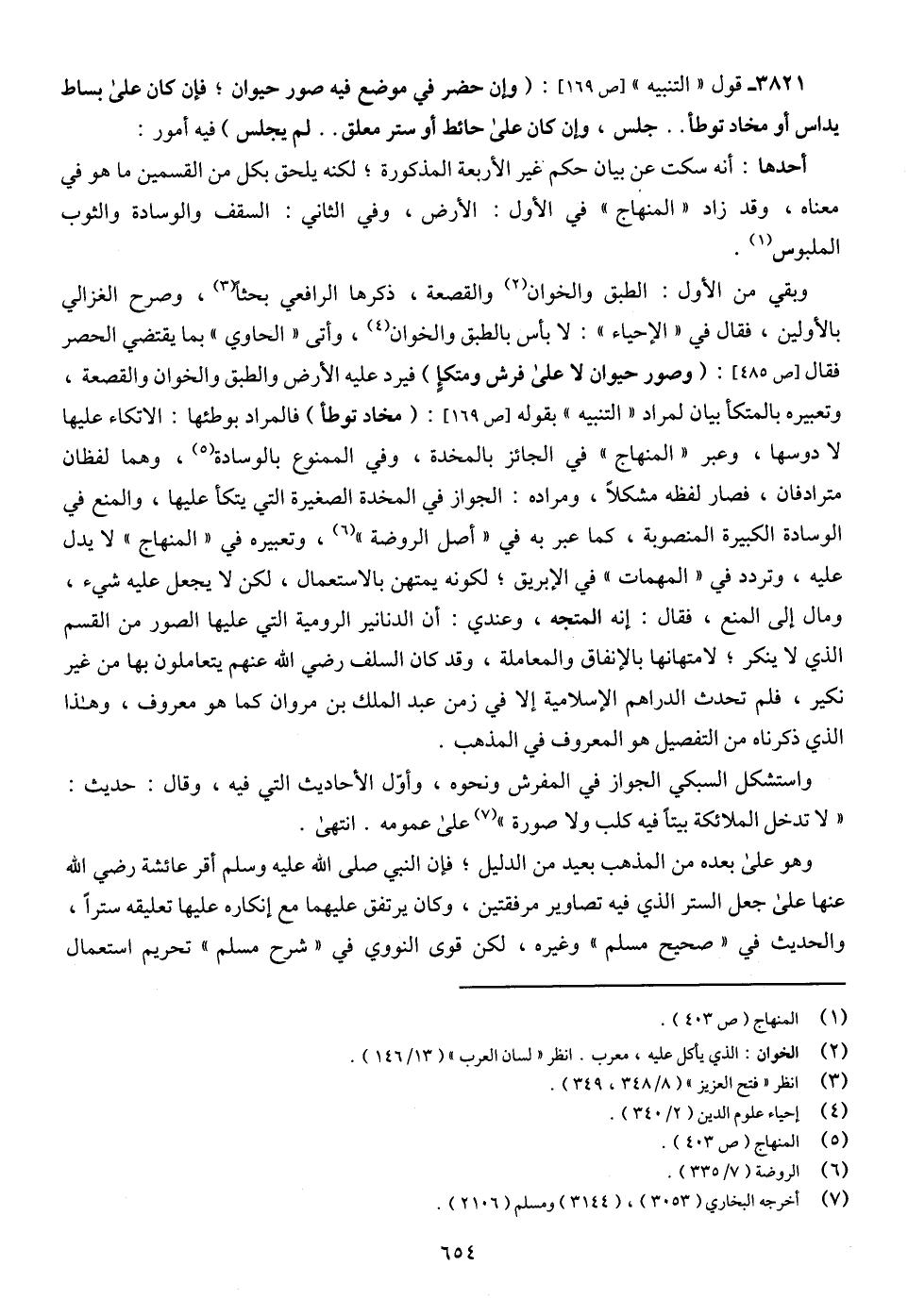 3821 - قول " التنبيه " [ص 169]: (وإن حضر في موضع فيه صور حيوان؛ فإن كان على بساط يداس أو مخاد توطأ .. جلس، وإن كان على حائط أو ستر معلق .. لم يجلس) فيه أمور: