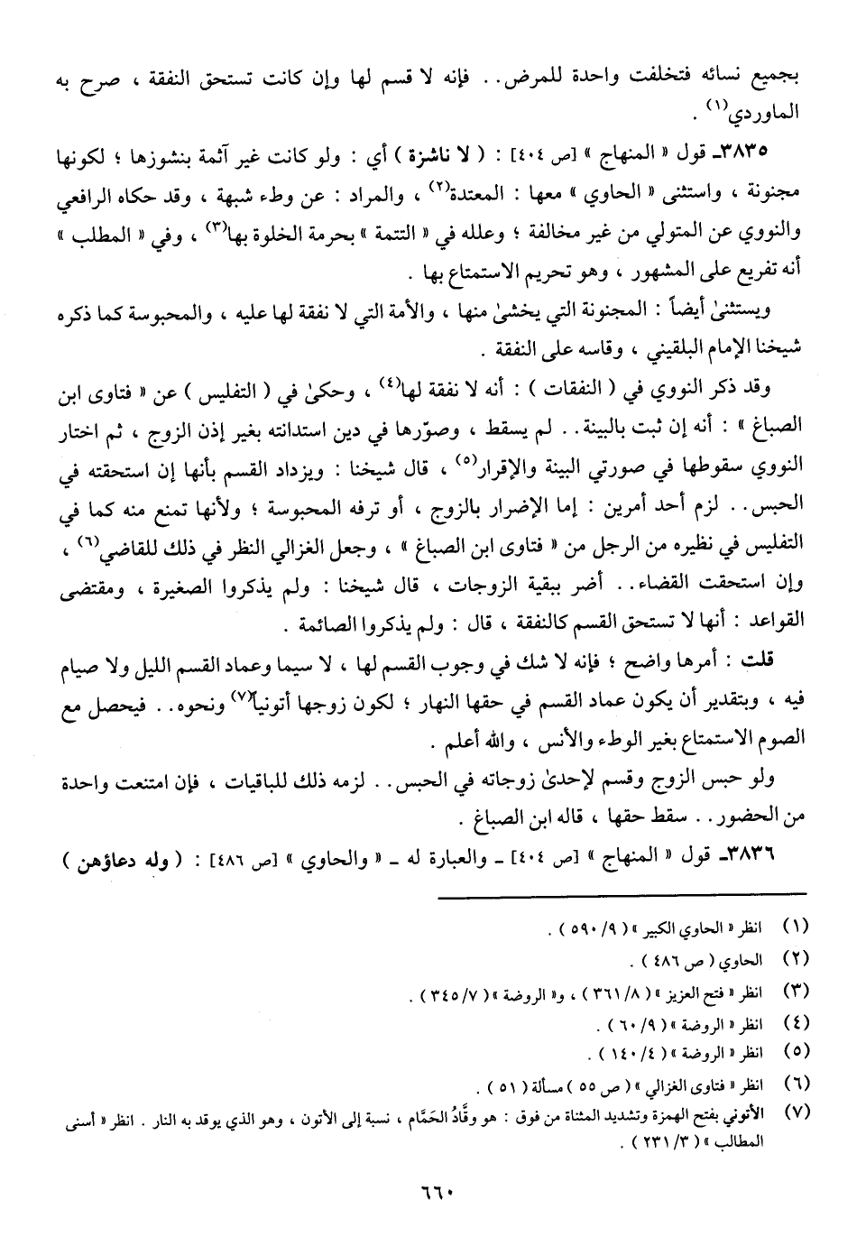 3835 - قول " المنهاج " [ص 404]: (لا ناشزة) أي: ولو كانت غير آثمة بنشوزها؛ لكونها مجنونة، واستثنى " الحاوي " معها: المعتدة (¬2)، والمراد: عن وطء شبهة، وقد حكاه الرافعي والنووي عن المتولي من غير مخالفة؛ وعلله في " التتمة " بحرمة الخلوة بها (¬3)، وفي " المطلب " أنه تفريع على المشهور، وهو تحريم الاستمتاع بها.