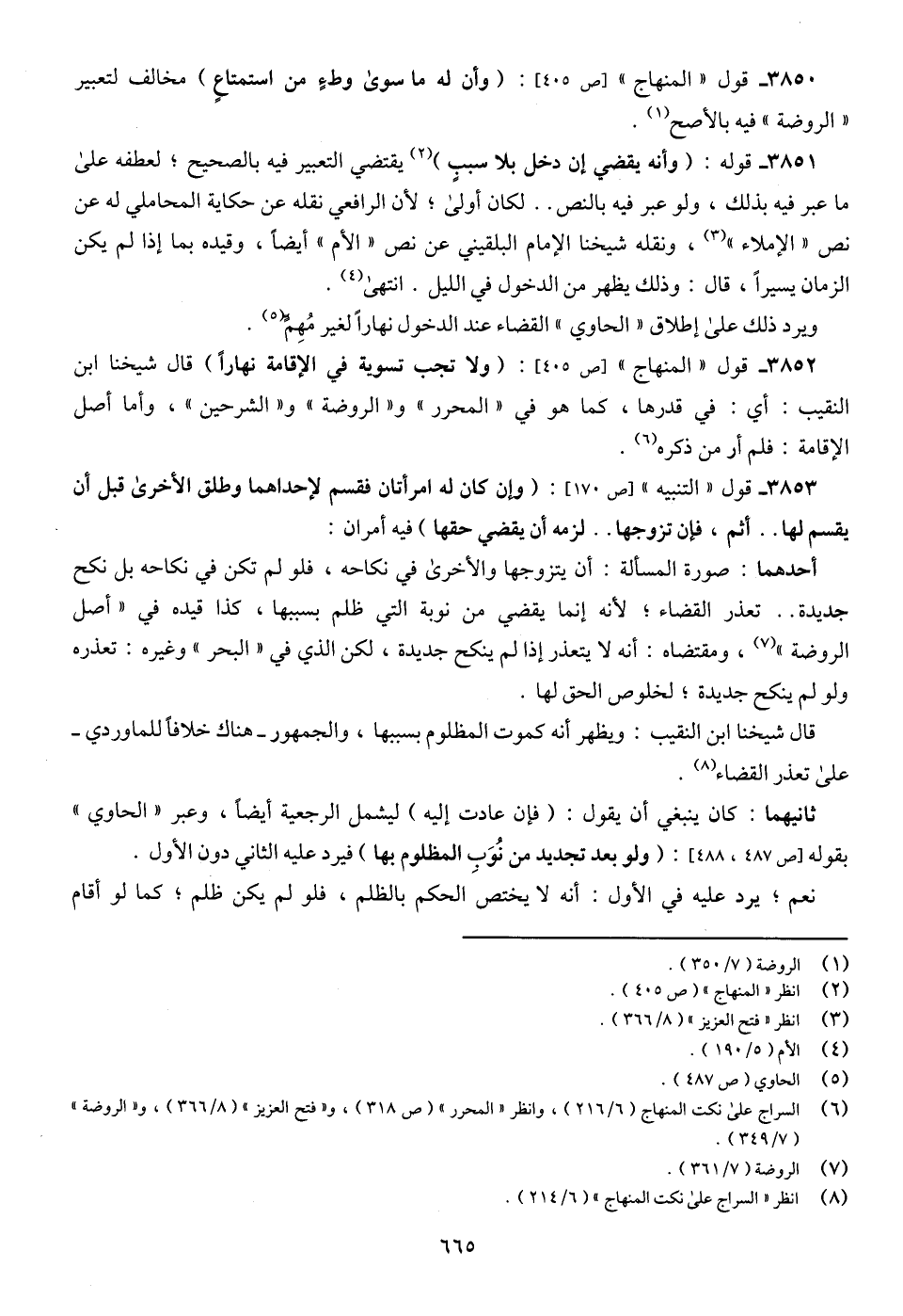 3852 - قول " المنهاج " [ص 405]: (ولا تجب تسوية في الإقامة نهاراً) قال شيخنا ابن النقيب: أي: في قدرها، كما هو في " المحرر " و" الروضة " و" الشرحين "، وأما أصل الإقامة: فلم أر من ذكره (¬6).