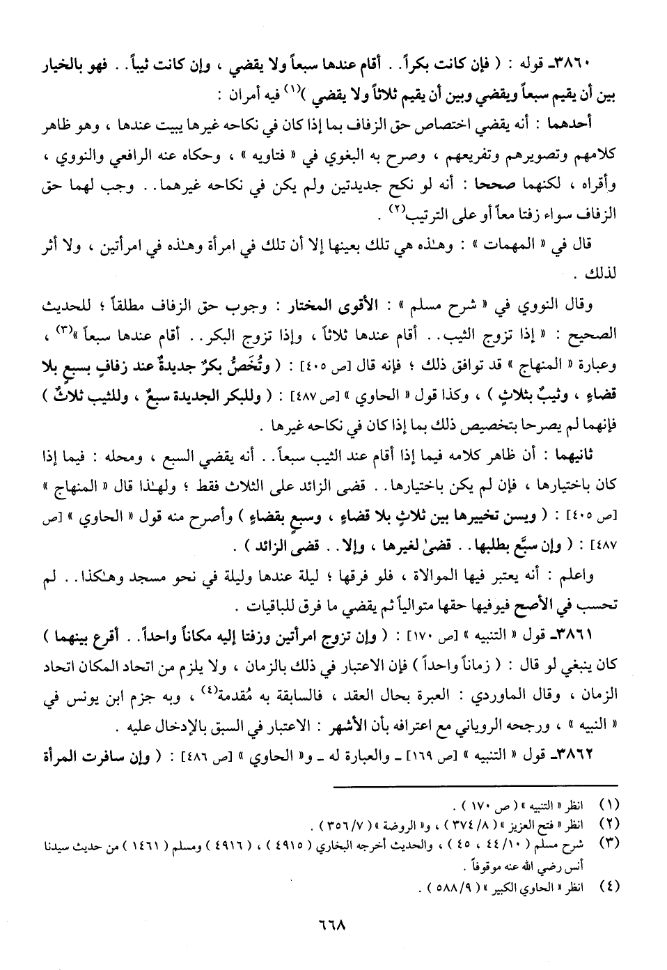 3860 - قوله: (فإن كانت بكراً .. أقام عندها سبعاً ولا يقضي، وإن كانت ثيباً .. فهو بالخيار بين أن يقيم سبعاً ويقضي وبين أن يقيم ثلاثاً ولا يقضي) (¬1) فيه أمران: