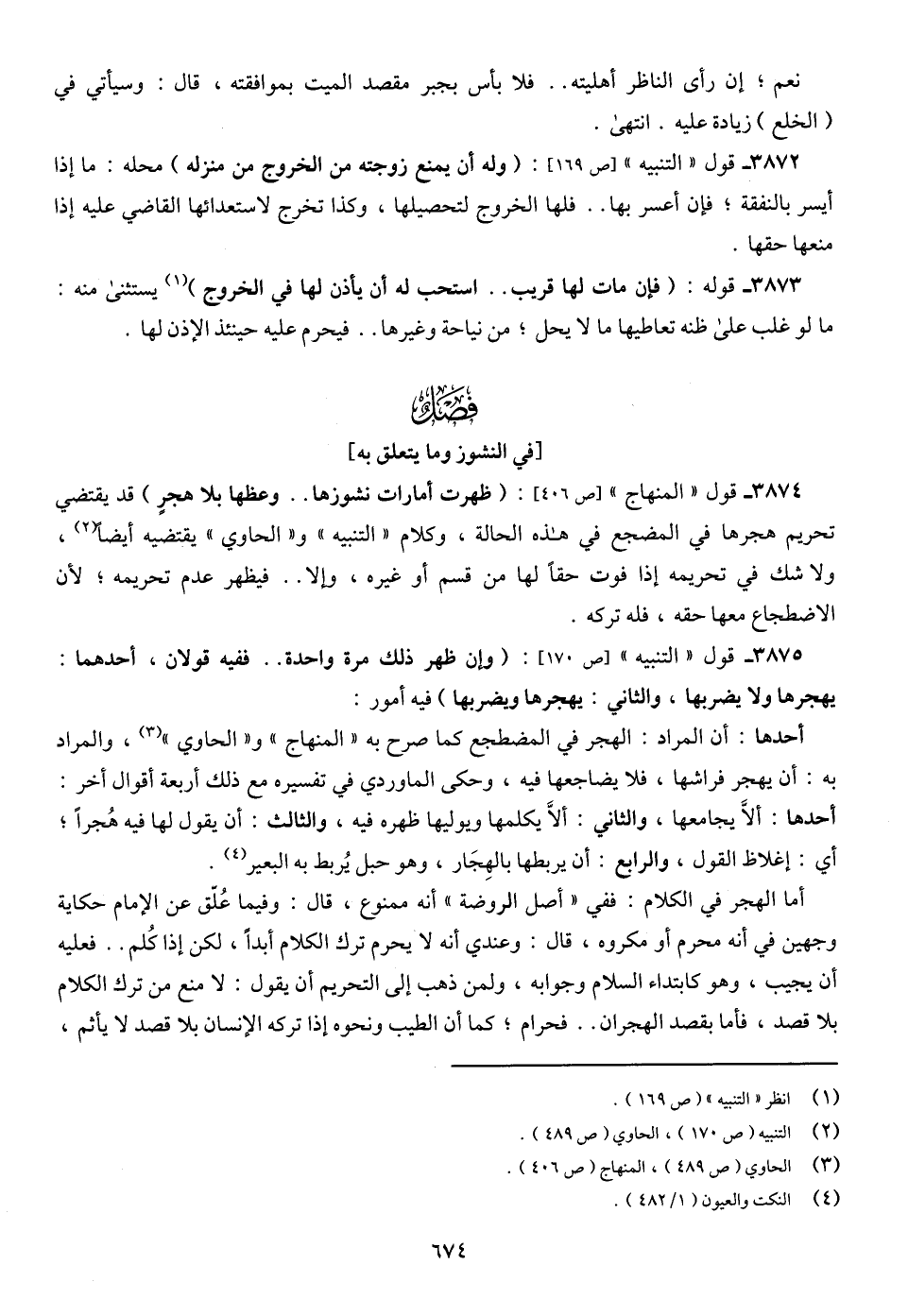 3874 - قول " المنهاج " [ص 406]: (ظهرت أمارات نشوزها .. وعظها بلا هجرٍ) قد يقتضي تحريم هجرها في المضجع في هذه الحالة، وكلام " التنبيه " و" الحاوي " يقتضيه أيضاً (¬2)، ولا شك في تحريمه إذا فوت حقًا لها من قسم أو غيره، وإلا .. فيظهر عدم تحريمه؛ لأن الاضطجاع معها حقه، فله تركه.