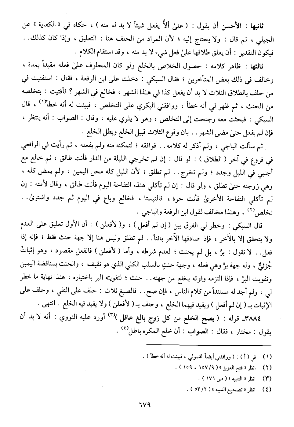ثانيها: الأحسن أن يقول: (على ألاَّ يفعل شيئًا لا بد له منه)، حكاه في " الكفاية " عن الجيلي، ثم قال: ولا يحتاج إليه؛ لأن المراد من الحلف هنا: التعليق، وإذا كان كذلك .. فيكون التقدير: أن يعلق طلاقها على فعل شيء لا بد منه، وقد استقام الكلام.