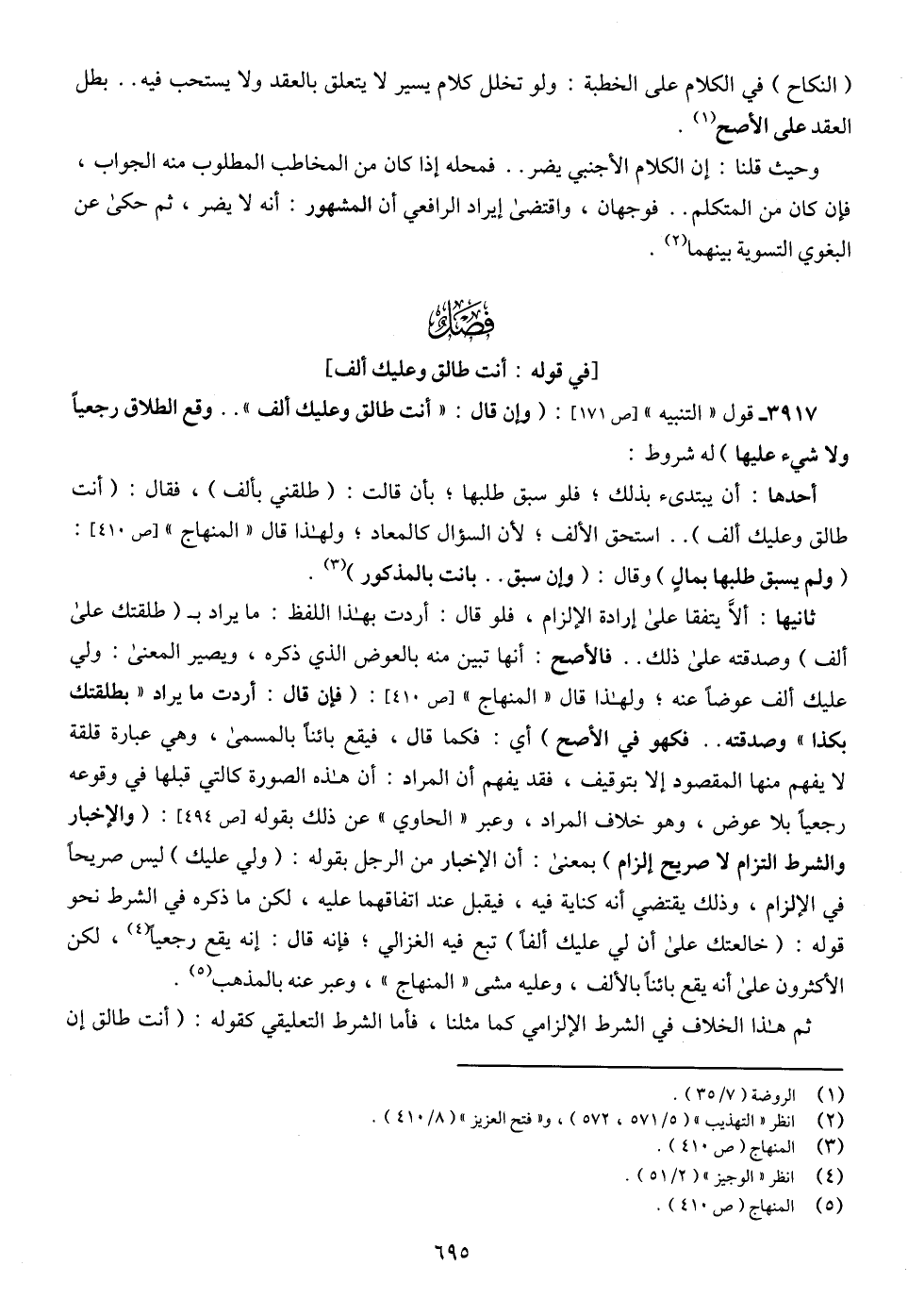 ثانيها: ألاَّ يتفقا على إرادة الإلزام، فلو قال: أردت بهذا اللفظ: ما يراد بـ (طلقتك على ألف) وصدقته على ذلك .. فالأصح: أنها تبين منه بالعوض الذي ذكره، ويصير المعنى: ولي عليك ألف عوضاً عنه؛ ولهذا قال " المنهاج " [ص 410]: (فإن قال: أردت ما يراد " بطلقتك بكذا " وصدقته .. فكهو في الأصح) أي: فكما قال، فيقع بائنًا بالمسمى، وهي عبارة قلقة لا يفهم منها المقصود إلا بتوقيف، فقد يفهم أن المراد: أن هذه الصورة كالتي قبلها في وقوعه رجعياً بلا عوض، وهو خلاف المراد، وعبر " الحاوي " عن ذلك بقوله [ص 494]: (والإخبار والشرط التزام لا صريح إلزام) بمعنى: أن الإخبار من الرجل بقوله: (ولي عليك) ليس صريحاً في الإلزام، وذلك يقتضي أنه كناية فيه، فيقبل عند اتفاقهما عليه، لكن ما ذكره في الشرط نحو قوله: (خالعتك على أن لي عليك ألفاً) تبع فيه الغزالي؛ فإنه قال: إنه يقع رجعياً (¬4)، لكن الأكثرون على أنه يقع بائناً بالألف، وعليه مشى " المنهاج "، وعبر عنه بالمذهب (¬5).