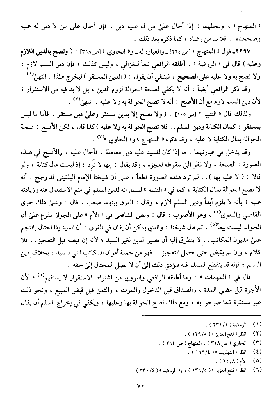 2297 - قول " المنهاج " [ص 264]- والعبارة له - و" الحاوي " [ص 318]: (وتصح بالدين اللازم وعليه) قال في " الروضة ": أطلقه الرافعي تبعًا للغزالي، وليس كذلك؛ فإن دين السلم لازم، ولا تصح به ولا عليه على الصحيح، فينبغي أن يقول: (الدين المستقر) ليخرج هذا. انتهى (¬1).