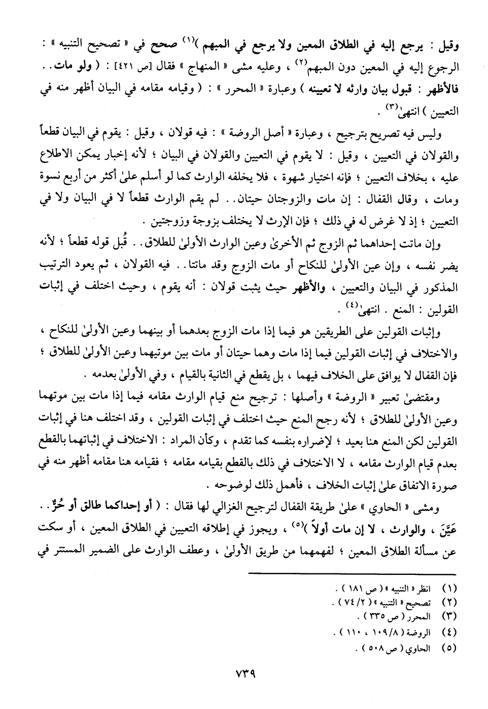 وليس فيه تصريح بترجيح، وعبارة " أصل الروضة ": فيه قولان، وقيل: يقوم في البيان قطعاً والقولان في التعيين، وقيل: لا يقوم في التعيين والقولان في البيان؛ لأنه إخبار يمكن الاطلاع عليه، بخلاف التعيين؛ فإنه اختيار شهوة، فلا يخلفه الوارث كما لو أسلم على أكثر من أربع نسوة ومات، وقال القفال: إن مات والزوجتان حيتان .. لم يقم الوارث قطعاً لا في البيان ولا في التعيين؛ إذ لا غرض له في ذلك؛ فإن الإرث لا يختلف بزوجة وزوجتين.