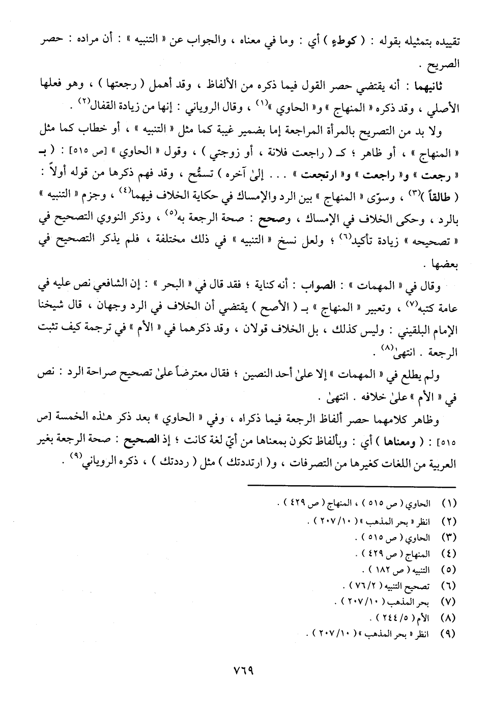 ولابد من التصريح بالمرأة المراجعة إما بضمير غيبة كما مثل "التنبيه"، أو خطاب كما مثل "المنهاج"، أو ظاهر؛ كـ (راجعت فلانة، أو زوجتي)، وقول "الحاوي" [ص 515]: (بـ "رجعت" و"راجعت" و"ارتجعت" ... إلى آخره) تسمُّح، وقد فهم ذكرها من قوله أولًا: (طالقًا) (¬3)، وسوّى "المنهاج" بين الرد والإمساك في حكاية الخلاف فيهما (¬4)، وجزم "التنبيه" بالرد، وحكى الخلاف في الإمساك، وصحح: صحة الرجعة به (¬5)، وذكر النووي التصحيح في "تصحيحه" زيادة تأكيد (¬6)، ولعل نسخ "التنبيه" في ذلك مختلفة، فلم يذكر التصحيح في بعضها.
