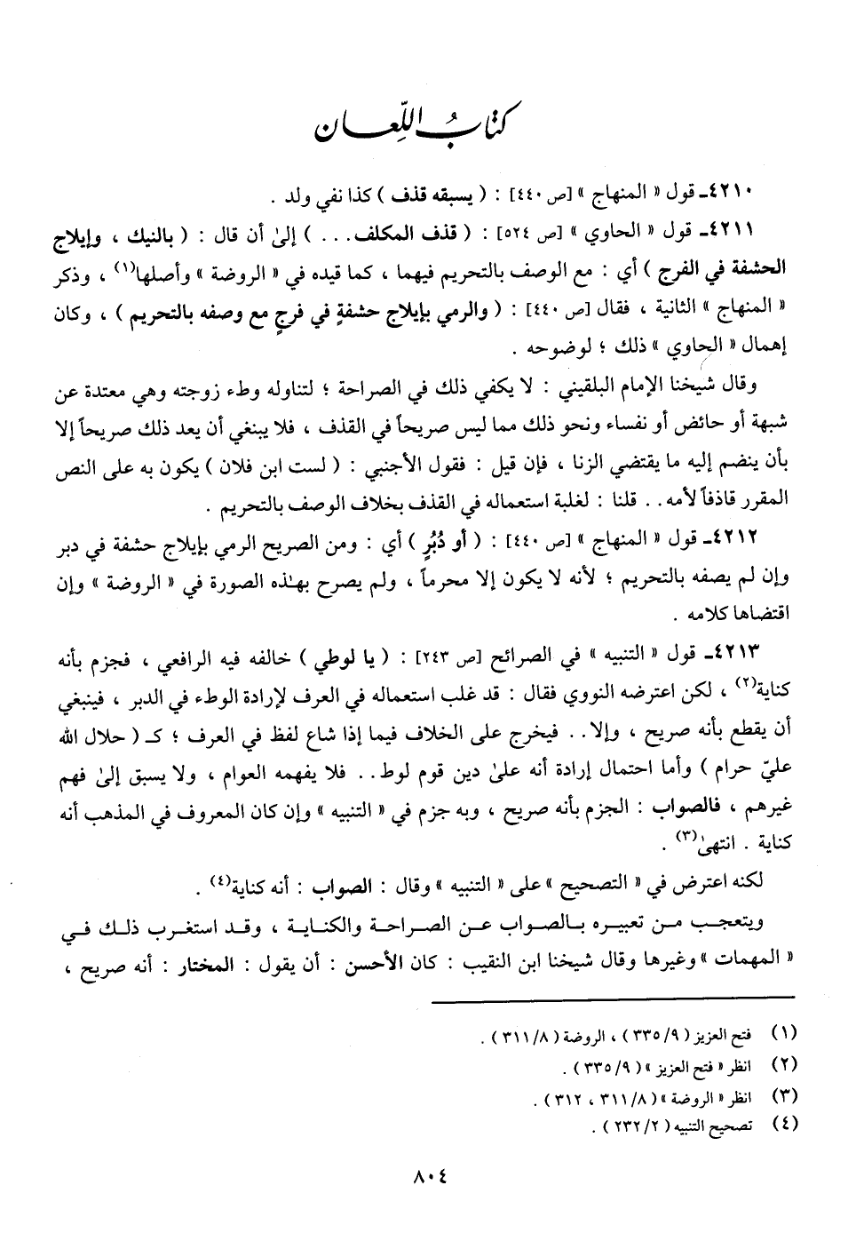 4211 - قول " الحاوي " [ص 524]: (قذف المكلف ... ) إلى أن قال: (بالنيك، وإيلاج الحشفة في الفرج) أي: مع الوصف بالتحريم فيهما، كما قيده في " الروضة " وأصلها (¬1)، وذى " المنهاج " الثانية، فقال [ص 440]: (والرمي بإيلاج حشفةٍ في فرج مع وصفه بالتحريم)، وكان إهمال " الحاوي " ذلك؛ لوضوحه.
