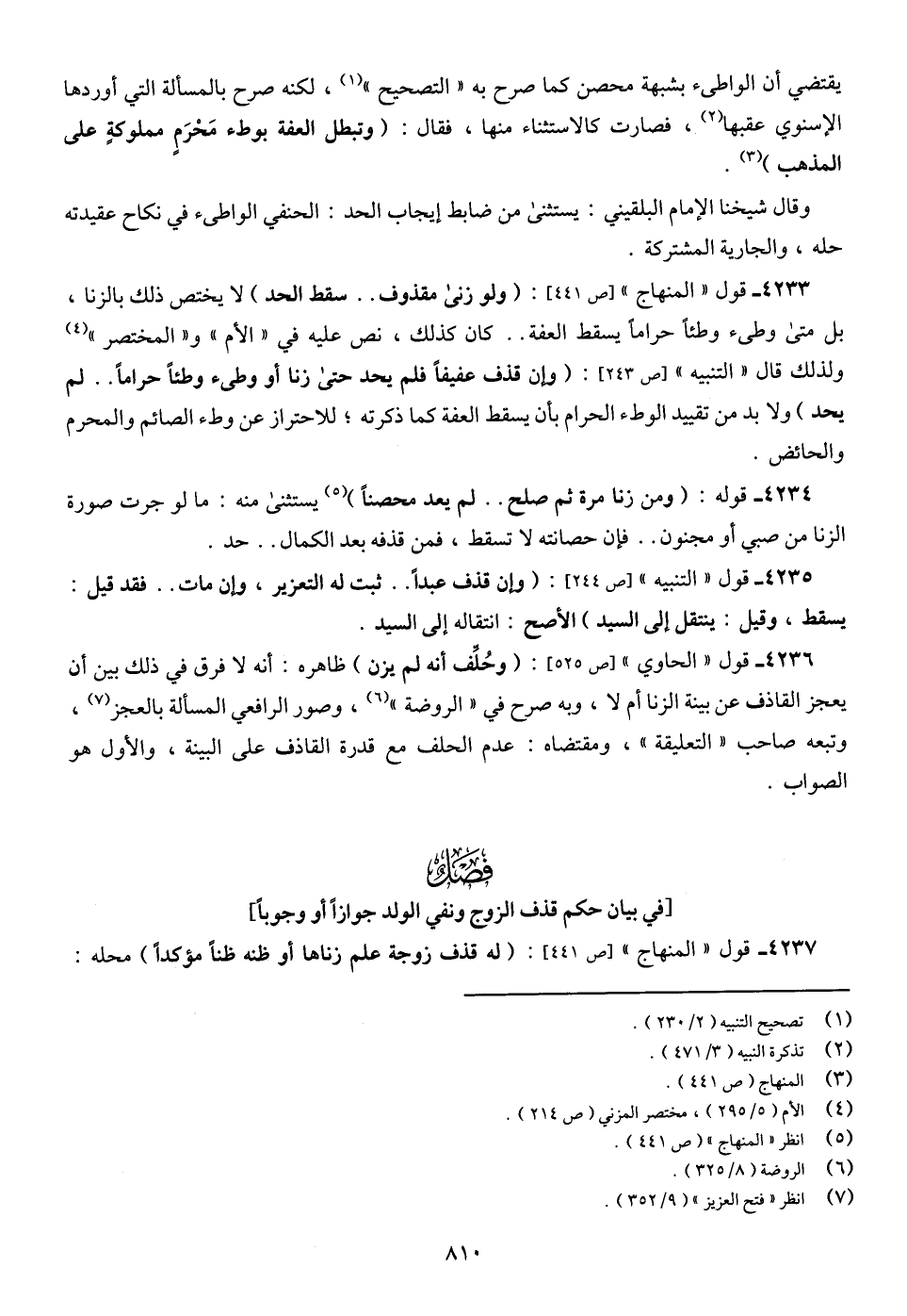 4237 - قول " المنهاج " [ص 441]: (له قذف زوجة علم زناها أو ظنه ظنًا مؤكدًا) محله: ¬__________