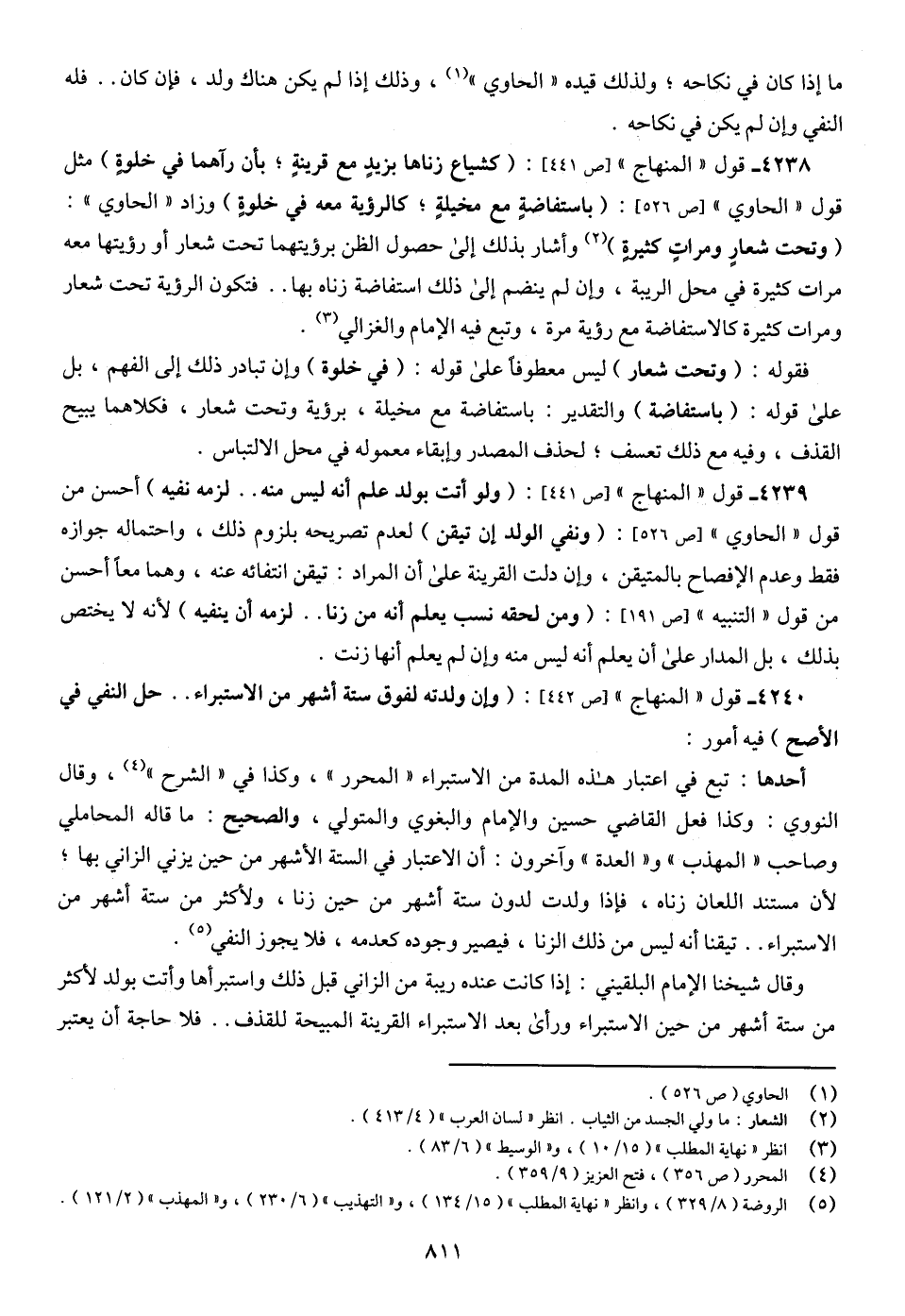 4239 - قول " المنهاج " [ص 441]: (ولو أتت بولد علم أنه ليس منه .. لزمه نفيه) أحسن من قول " الحاوي " [ص 526]: (ونفي الولد إن تيقن) لعدم تصريحه بلزوم ذلك، واحتماله جوازه فقط وعدم الإفصاح بالمتيقن، وإن دلت القرينة على أن المراد: تيقن انتفائه عنه، وهما معًا أحسن من قول " التنبيه " [ص 191]: (ومن لحقه نسب يعلم أنه من زنا .. لزمه أن ينفيه) لأنه لا يختص بذلك، بل المدار على أن يعلم أنه ليس منه وإن لم يعلم أنها زنت.