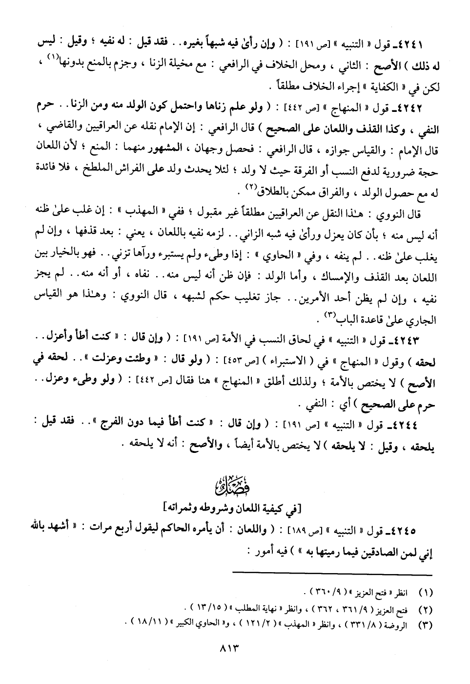 قال النووي: هذا النقل عن العراقيين مطلقًا غير مقبول؛ ففي " المهذب ": إن غلب على ظنه أنه ليس منه؛ بأن كان يعزل ورأى فيه شبه الزاني .. لزمه نفيه باللعان، يعني: بعد قذفها، وإن لم يغلب على ظنه .. لم ينفه، وفي " الحاوي ": إذا وطئ ولم يستبرء ورآها تزني .. فهو بالخيار بين اللعان بعد القذف والإمساك، وأما الولد: فإن ظن أنه ليس منه .. نفاه، أو أنه منه .. لم يجز نفيه، وإن لم يظن أحد الأمرين .. جاز تغليب حكم لشبهه، قال النووي: وهذا هو القياس الجاري على قاعدة الباب (¬3).