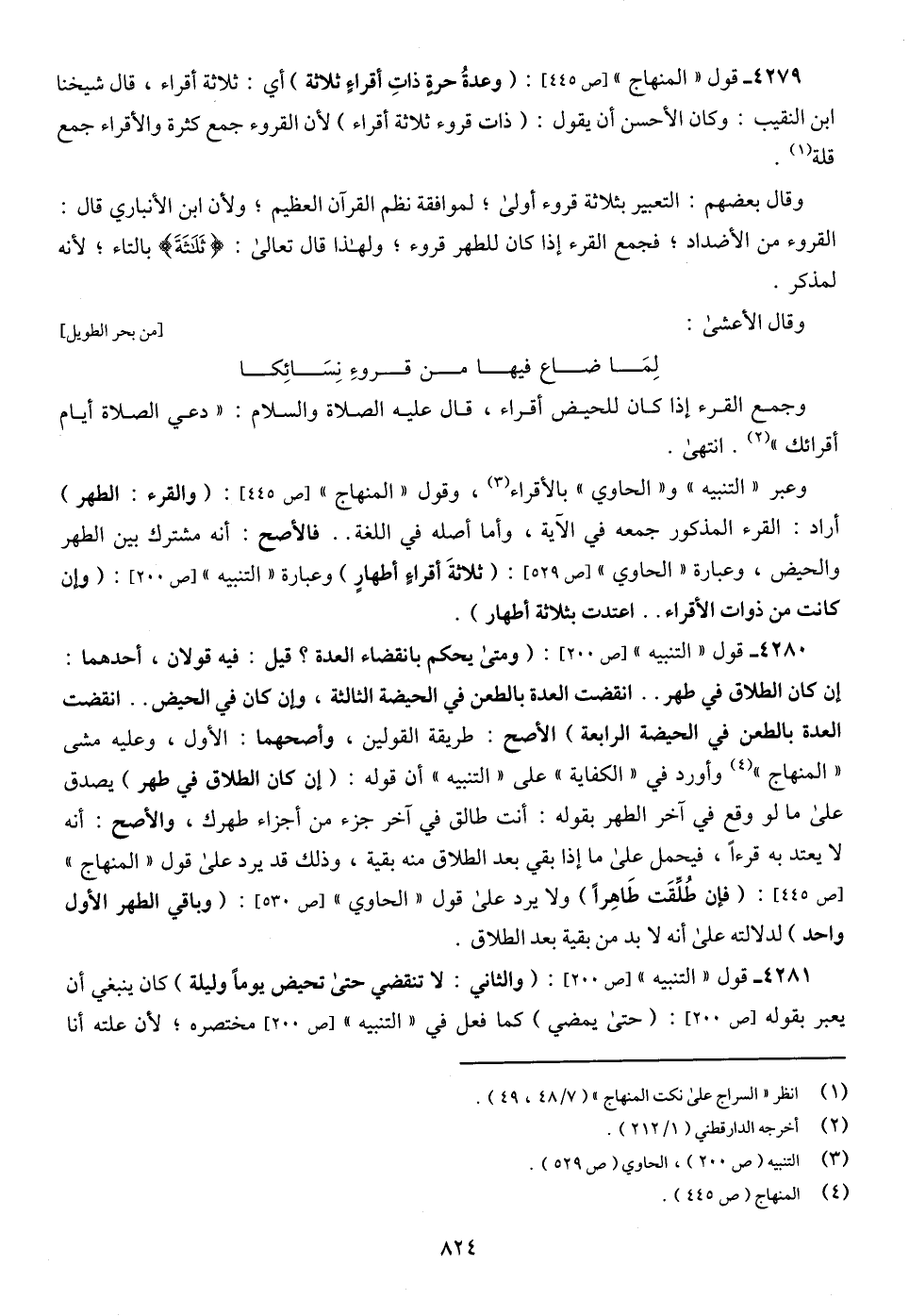4279 - قول " المنهاج " [ص 445]: (وعدةُ حرةٍ ذاتِ أقراءٍ ثلاثة) أي: ثلاثة أقراء، قال شيخنا ابن النقيب: وكان الأحسن أن يقول: (ذات قروء ثلاثة أقراء) لأن القروء جمع كثرة والأقراء جمع قلة (¬1).