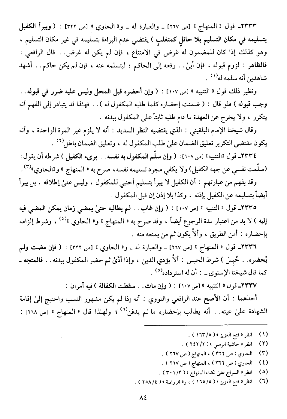 2334 - قول "التنبيه " [ص 107]: (وإن سلّم المكفول به نفسه .. برئ الكفيل) شرطه أن يقول: (سلّمت نفسي عن جهة الكفيل) ولا يكفي مجرد تسليمه نفسه، صرح به " المنهاج " و"الحاوي " (¬3).