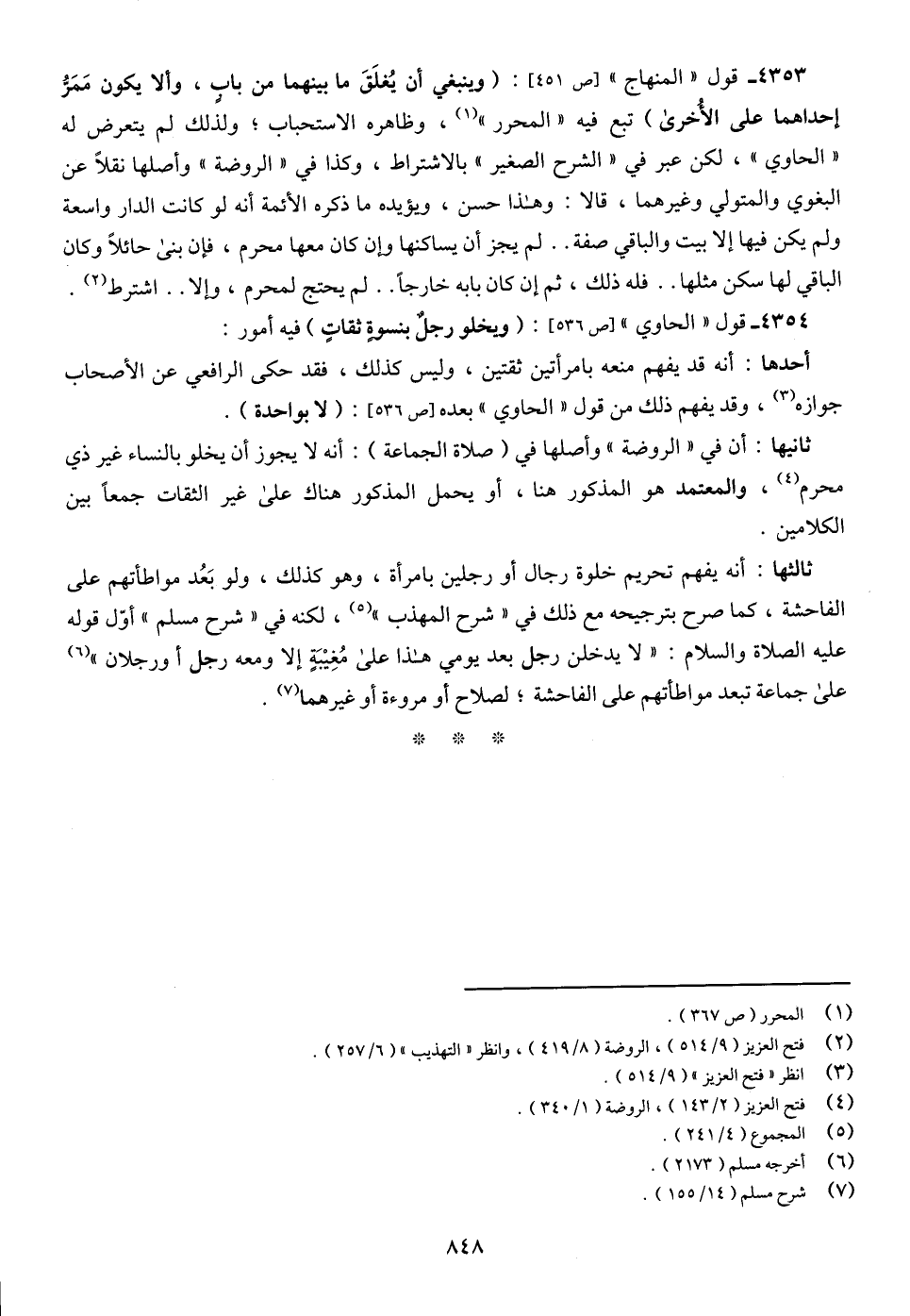 4353 - قول "المنهاج" [ص 451]: (وينبغي أن يُغلَقَ ما بينهما من بابٍ، وألا يكون مَمَرُّ إحداهما على الأُخرى) تبع فيه "المحرر" (¬1)، وظاهره الاستحباب؛ ولذلك لم يتعرض له "الحاوي"، لكن عبر في "الشرح الصغير" بالاشتراط، وكذا في "الروضة" وأصلها نقلًا عن البغوي والمتولي وغيرهما، قالا: وهذا حسن، ويؤيده ما ذكره الأئمة أنه لو كانت الدار واسعة ولم يكن فيها إلا بيت والباقي صفة .. لم يجز أن يساكنها وإن كان معها محرم، فإن بني حائلًا وكان الباقي لها سكن مثلها .. فله ذلك، ثم إن كان بابه خارجًا .. لم يحتج لمحرم، وإلا .. اشترط (¬2).