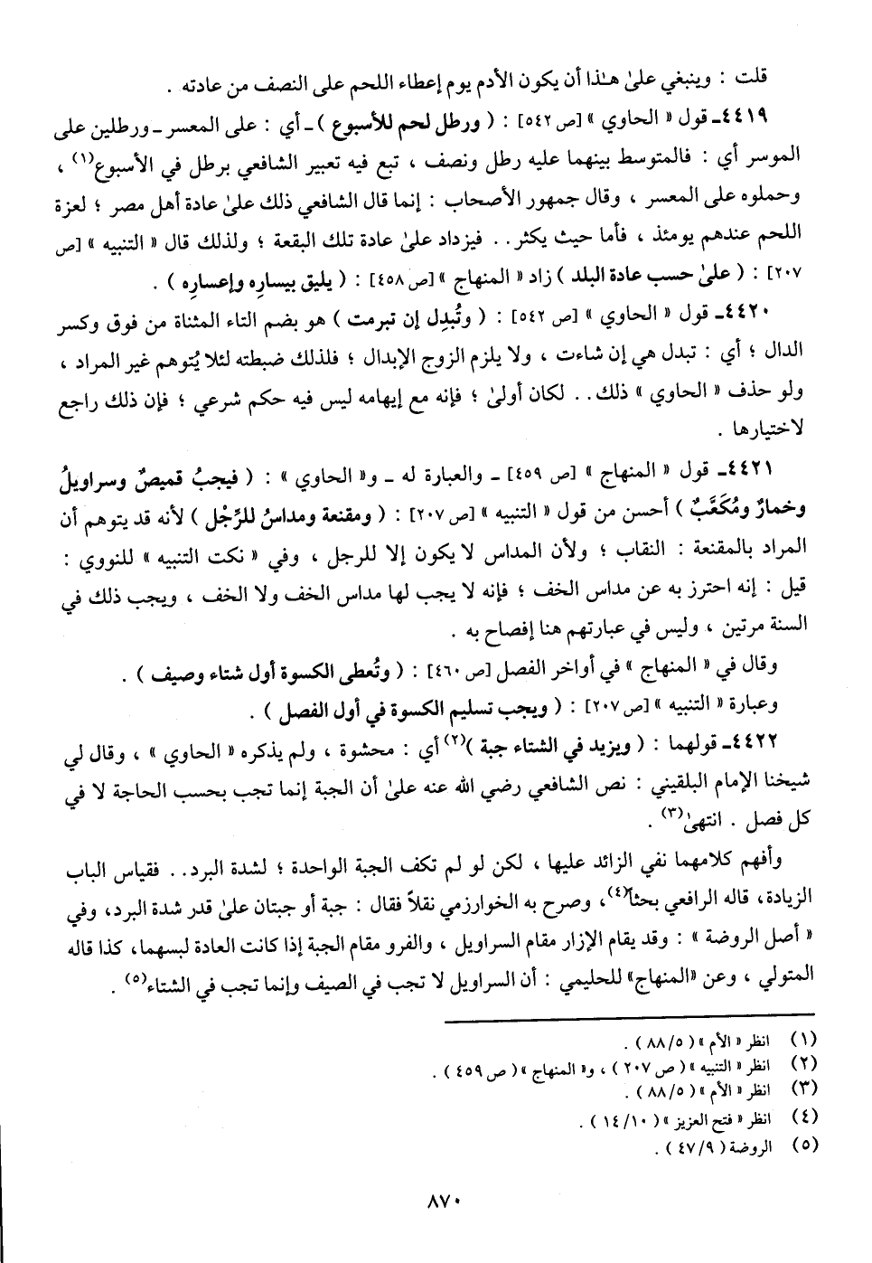 4421 - قول "المنهاج" [ص 459]- والعبارة له - و "الحاوي": (فيجبُ قميصٌ وسراويلُ وخمارٌ ومُكَعَّبٌ) أحسن من قول "التنبيه" [ص 207]: (ومقنعة ومداسُ للرِّجْل) لأنه قد يتوهم أن المراد بالمقنعة: النقاب؛ ولأن المداس لا يكون إلا للرجل، وفي "نكت التنبيه" للنووي: قيل: إنه احترز به عن مداس الخف؛ فإنه لا يجب لها مداس الخف ولا الخف، ويجب ذلك في السنة مرتين، وليس في عبارتهم هنا إفصاح به.