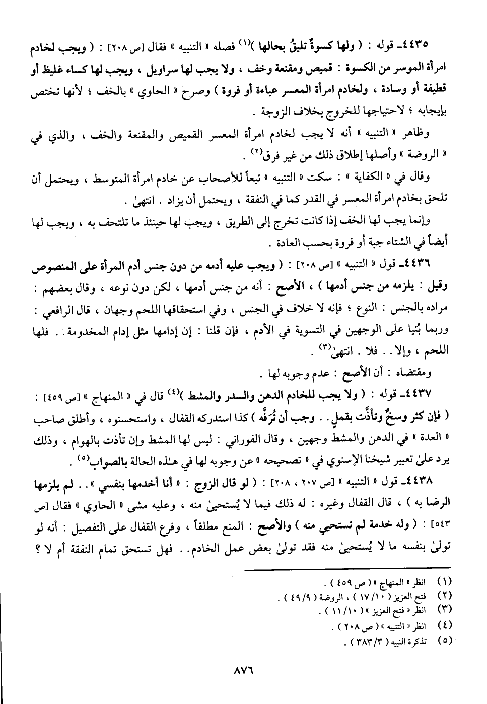 4436 - قول "التنبيه" [ص 208]: (ويجب عليه أدمه من دون جنس آدم المرأة على المنصوص وقيل: يلزمه من جنس أدمها)، الأصح: أنه من جنس أدمها, لكن دون نوعه، وقال بعضهم: مراده بالجنس: النوع؛ فإنه لا خلاف في الجنس، وفي استحقاقها اللحم وجهان، قال الرافعي: وربما بُنيا على الوجهين في التسوية في الأدم، فإن قلنا: إن إدامها مثل إدام المخدومة .. فلها اللحم، وإلا .. فلا. انتهى (¬3).