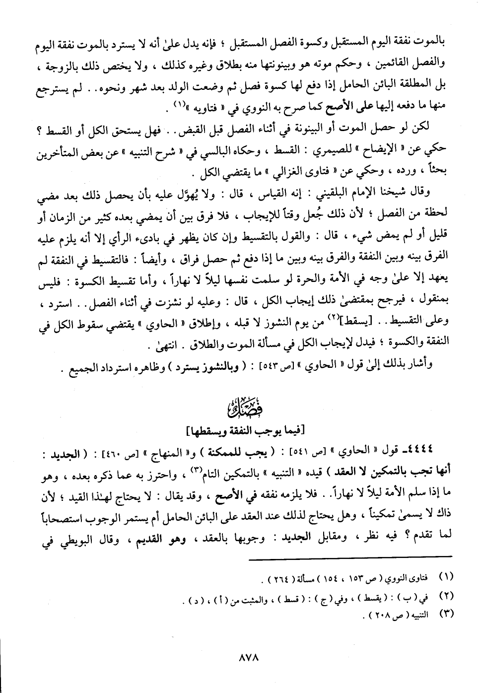 بالموت نفقة اليوم المستقبل وكسوة الفصل المستقبل؛ فإنه يدل على أنه لا يسترد بالموت نفقة اليوم والفصل القائمين، وحكم موته هو وبينونتها منه بطلاق وغيره كذلك، ولا يختص ذلك بالزوجة، بل المطلقة البائن الحامل إذا دفع لها كسوة فصل ثم وضعت الولد بعد شهر ونحوه .. لم يسترجع منها ما دفعه إليها على الأصح كما صرح به النووي في "فتاويه" (¬1).